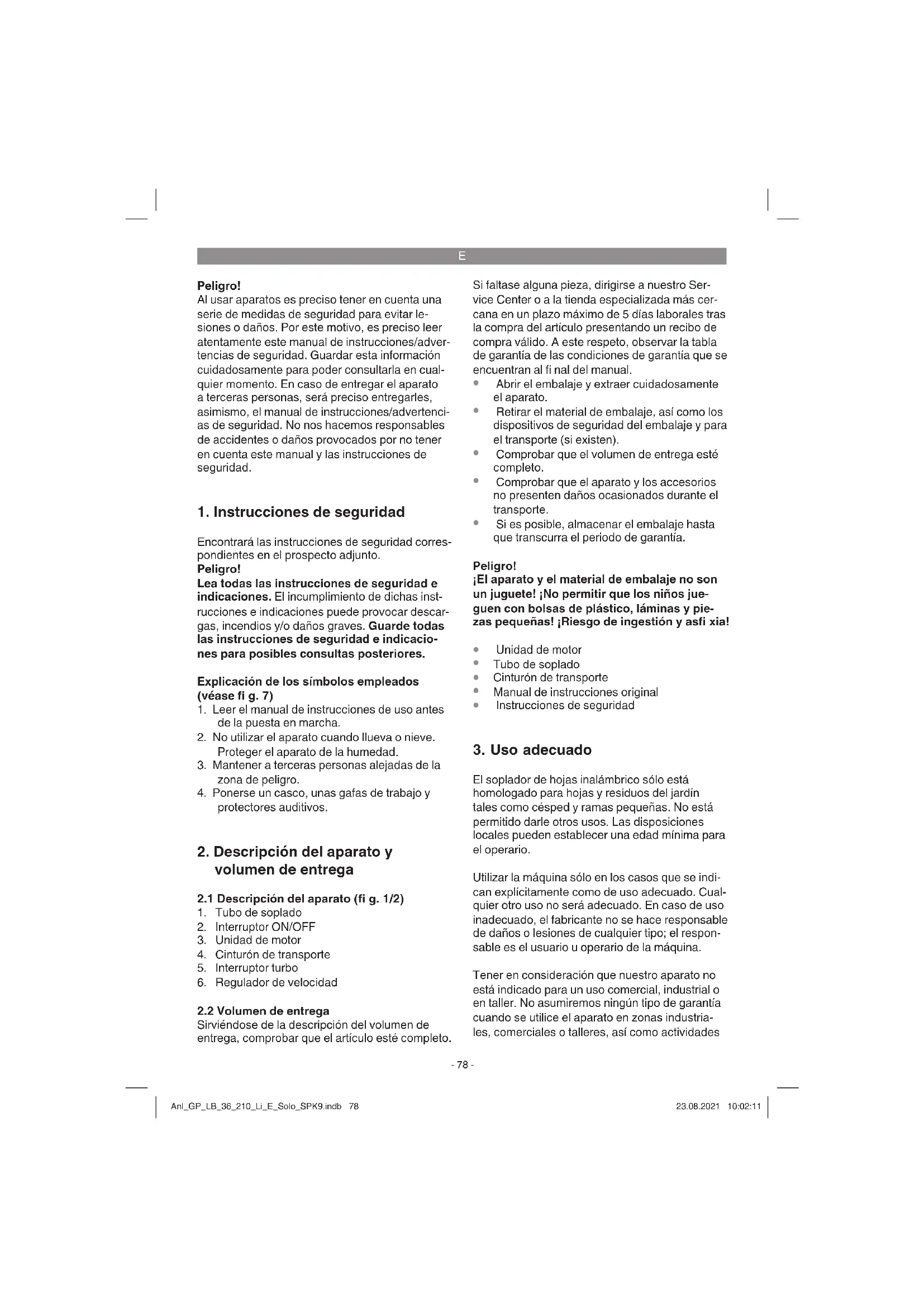 El soplador de hojas inalámbrico sólo está homologado para hojas y residuos del jardín tales como césped y ramas pequeñas. No está permitido darle otros usos. Las disposiciones locales pueden establecer una edad mínima para el operario. Utilizar la máquina sólo en los casos que se indi- can explícitamente como de uso adecuado. Cual- quier otro uso no será adecuado. En caso de uso inadecuado, el fabricante no se hace responsable de daños o lesiones de cualquier tipo; el respon- sable es el usuario u operario de la máquina. Tener en consideración que nuestro aparato no está indicado para un uso comercial, industrial o en taller. No asumiremos ningún tipo de garantía cuando se utilice el aparato en zonas industria- les, comerciales o talleres, así como actividades Anl_GP_LB_36_210_Li_E_Solo_SPK9.indb 78Anl_GP_LB_36_210_Li_E_Solo_SPK9.indb 78 23.08.2021 10:02:1123.08.2021 10:02:11E