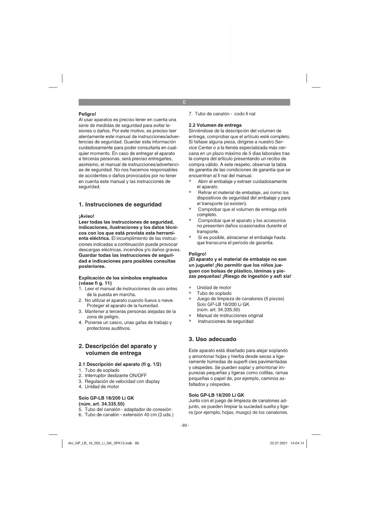 Este aparato está diseñado para alejar soplando y amontonar hojas y hierba desde secas a lige- ramente húmedas de superfi cies pavimentadas y céspedes. Se pueden soplar y amontonar im- purezas pequeñas y ligeras como colillas, ramas pequeñas o papel de, por ejemplo, caminos as- faltados y céspedes. Solo GP-LB 18/200 Li GK Junto con el juego de limpieza de canalones ad- junto, se pueden limpiar la suciedad suelta y lige- ra (por ejemplo, hojas, musgo) de los canalones. Anl_GP_LB_18_200_Li_GK_SPK13.indb 89Anl_GP_LB_18_200_Li_GK_SPK13.indb 89 20.07.2021 14:04:1420.07.2021 14:04:14E