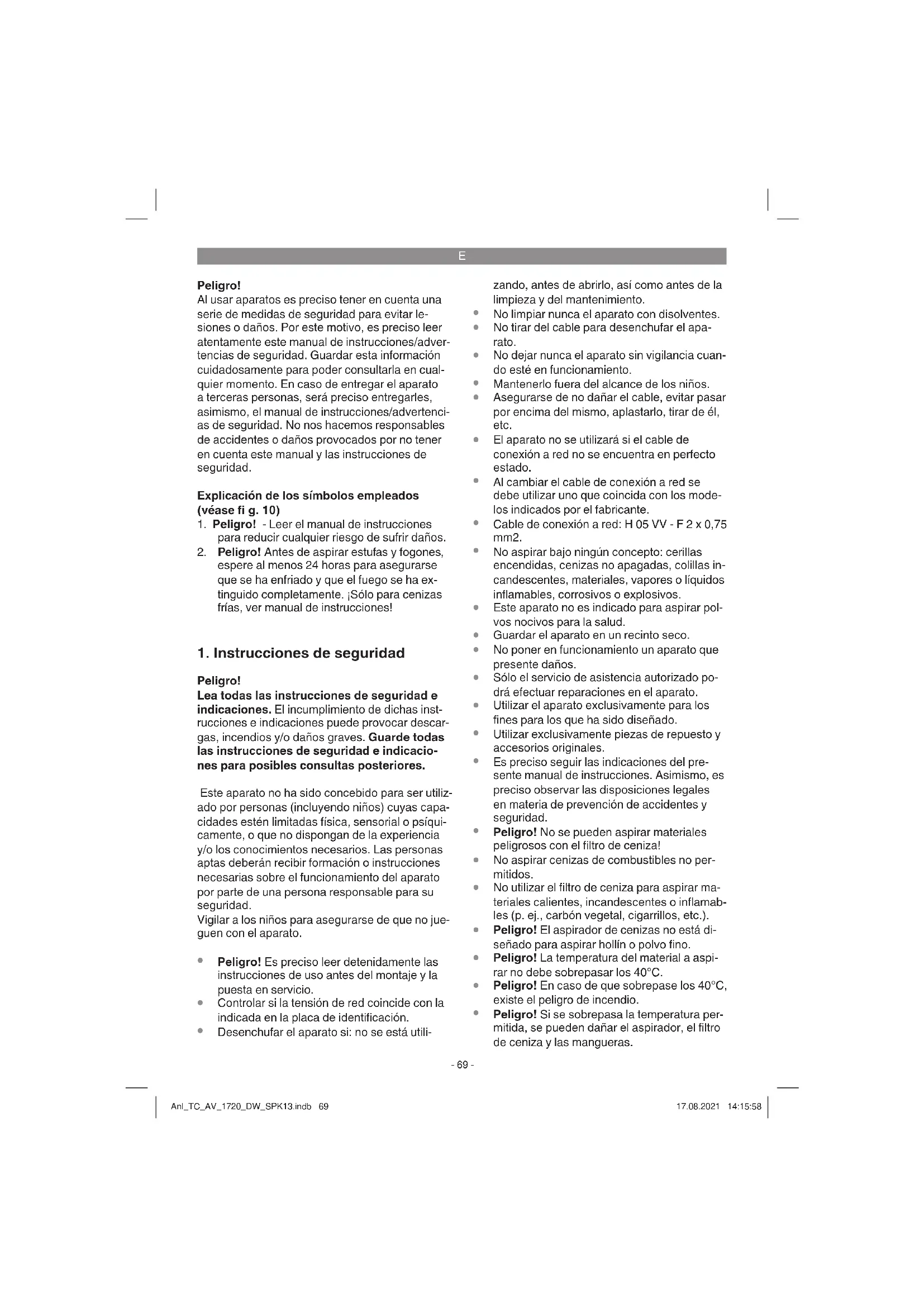Peligro! Si se sobrepasa la temperatura per- mitida, se pueden dañar el aspirador, el filtro de ceniza y las mangueras. Anl_TC_AV_1720_DW_SPK13.indb 69Anl_TC_AV_1720_DW_SPK13.indb 69 17.08.2021 14:15:5817.08.2021 14:15:58E