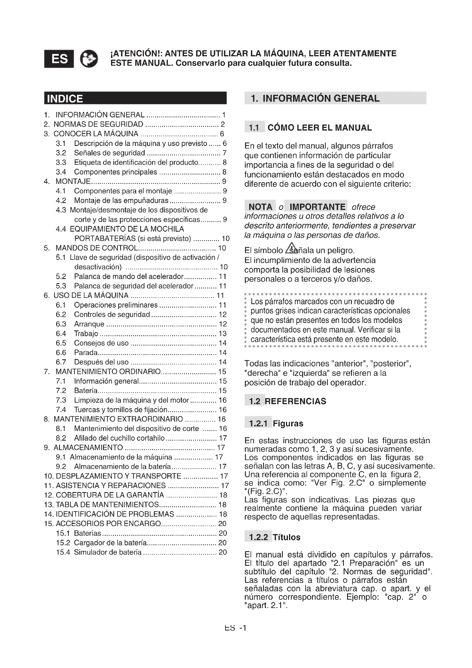 [2] Tensión de alimentación MÁX [3] Tensión de alimentación NOMINAL [4] Velocidad máxima de rotación de la herramienta (cabezal porta hilo) [5] Velocidad máxima de rotación de la herramienta (cuchilla de 4 puntas) [6] Ancho de corte (cabezal porta hilo) [7] Ancho de corte (cuchilla de 4 puntas) [8] Enganche cabezal porta hilo [9] Diámetro hilo cabezal (máx) [10] Código dispositivo de corte [11] Código de protección [12] Peso con grupo de batería [13] Cortahierbas [14] Nivel de presión sonora (según ISO 3744:2010) [15] Incertidumbre de medida [16] Nivel de potencia sonora medido (según ISO 3744:2010) [17] Nivel de potencia sonora garantizado (según 2000/14/EC) [18] Desbrozadora [19] Vibraciones transmitidas a la mano en la empuñadura anterior (según ISO 3744:2010) [20] Vibraciones transmitidas a la mano en la empuñadura posterior (según ISO 3744:2010) [21] OPCIONES [22] Mando alta velocidad del dispositivo de corte [23] Accesorios bajo pedido [24] Grupo de batería [25] Cargador de batería [26] Mochila portabaterías [27] Simulador de batería (*) El uso de esta batería está permitido únicamente con la mochila portabaterías. Queda prohibido introducir la batería en la cavidad de la máquina. a) NOTA: el valor total de la vibración se ha medido según un método normalizado de prueba y puede utilizarse para realizar una comparaciàon entre una máquina y otra . El valor total de la vibración también se puede emplear para la valoración preliminar de la exposición. b) ADVERTENCIA: la emisión de vibración en el uso efectivo del aparato puede ser diferente al valor total declarado según los modos en los que se utiliza la herramienta. Por ello, durante la actividad se deben poner en práctica las siguientes medidas de seguridad para el usuario: usar guantes, limitar el tiempo de uso de la máquina, así como el tiempo que se mantiene presionada la palanca de mando del acelerador.