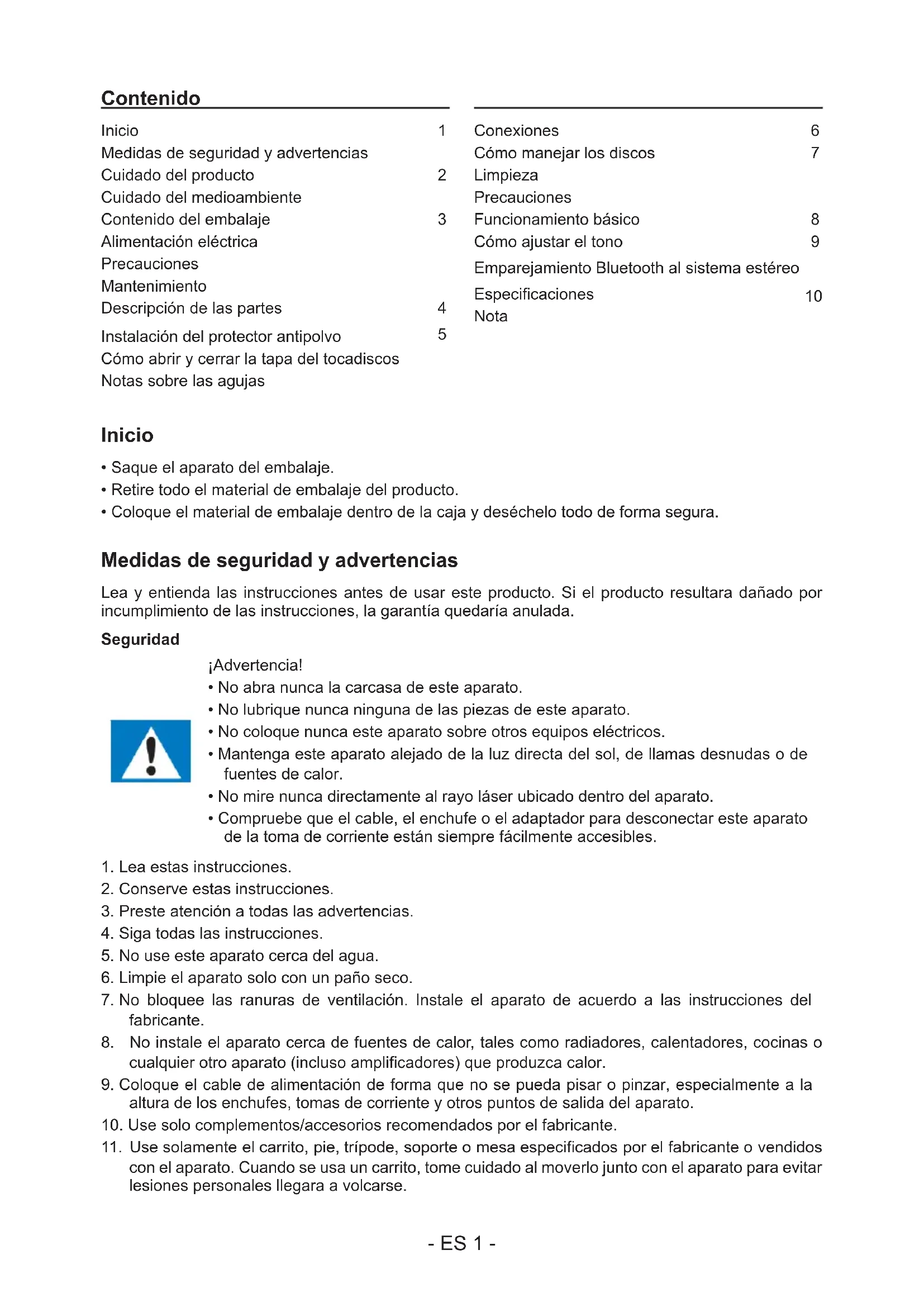 Inicio Medidas de seguridad y advertencias Cuidado del producto Cuidado del medioambiente Contenido del embalaje Alimentación eléctrica Precauciones Mantenimiento Descripción de las partes Instalación del protector antipolvo Cómo abrir y cerrar la tapa del tocadiscos Notas sobre las agujas