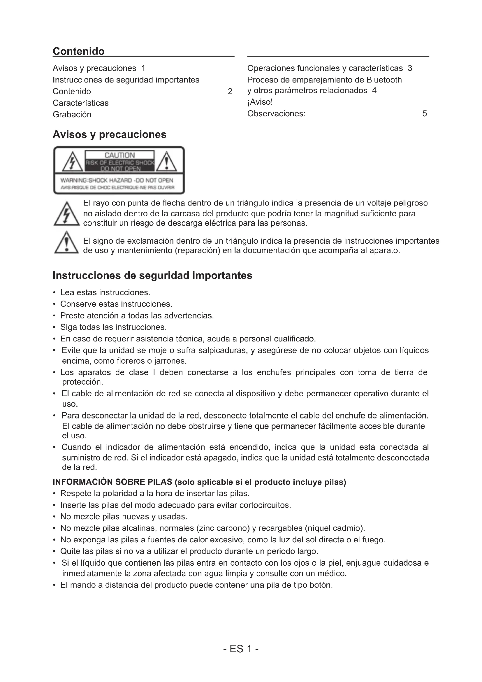 LEA ATENTAMENTE LAS INSTRUCCIONES ANTES DE USAR EL APARATO Y GUÁRDELAS PARA FUTURAS CONSULTAS. ES- ES 1 - Contenido Avisos y precauciones 1 Instrucciones de seguridad importantes Contenido 2 Características Grabación Operaciones funcionales y características 3 Proceso de emparejamiento de Bluetooth y otros parámetros relacionados 4 ¡Aviso! Observaciones: 5 Avisos y precauciones El rayo con punta de echa dentro de un triángulo indica la presencia de un voltaje peligroso no aislado dentro de la carcasa del producto que podría tener la magnitud suciente para constituir un riesgo de descarga eléctrica para las personas. El signo de exclamación dentro de un triángulo indica la presencia de instrucciones importantes de uso y mantenimiento (reparación) en la documentación que acompaña al aparato. Instrucciones de seguridad importantes