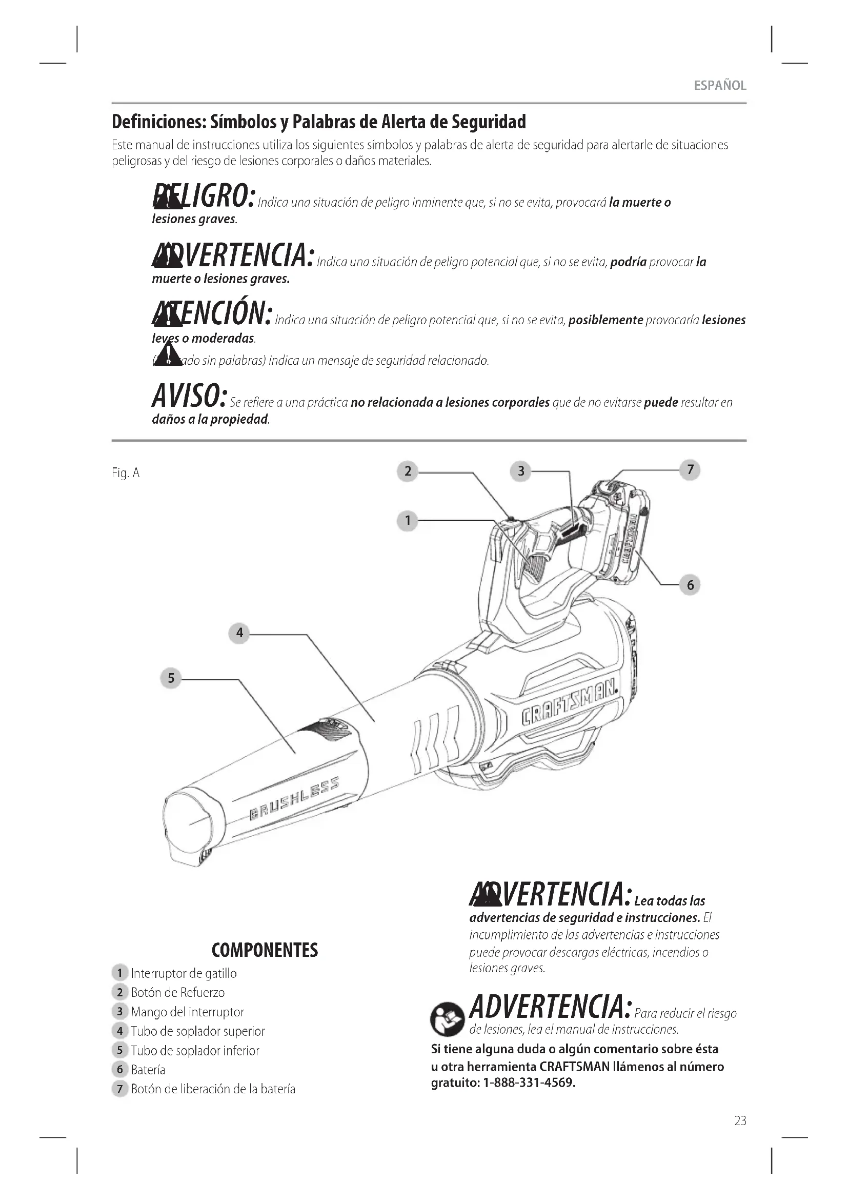 ADVERTENCIA: Lea todas las advertencias de seguridad e instrucciones. El incumplimiento de las advertencias e instrucciones puede provocar descargas eléctricas, incendios o lesionesgraves. ADVERTENCIA: Para reducir el riesgo de lesiones, lea el manual deinstrucciones. Si tiene alguna duda o algún comentario sobre ésta u otra herramienta CRAFTSMAN llámenos al número gratuito: 1-888-331-4569.EsPAñOl