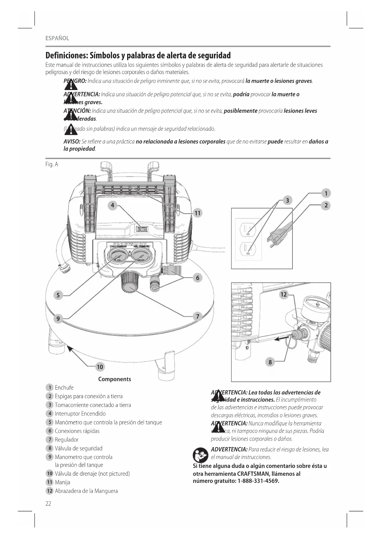ADVERTENCIA: Nunca modifique la herramienta eléctrica, ni tampoco ninguna de sus piezas. Podría producir lesiones corporales odaños. ADVERTENCIA: Para reducir el riesgo de lesiones, lea el manual deinstrucciones. Si tiene alguna duda o algún comentario sobre ésta u otra herramienta CRAFTSMAN, llámenos al número gratuito: 1-888-331-4569. Components