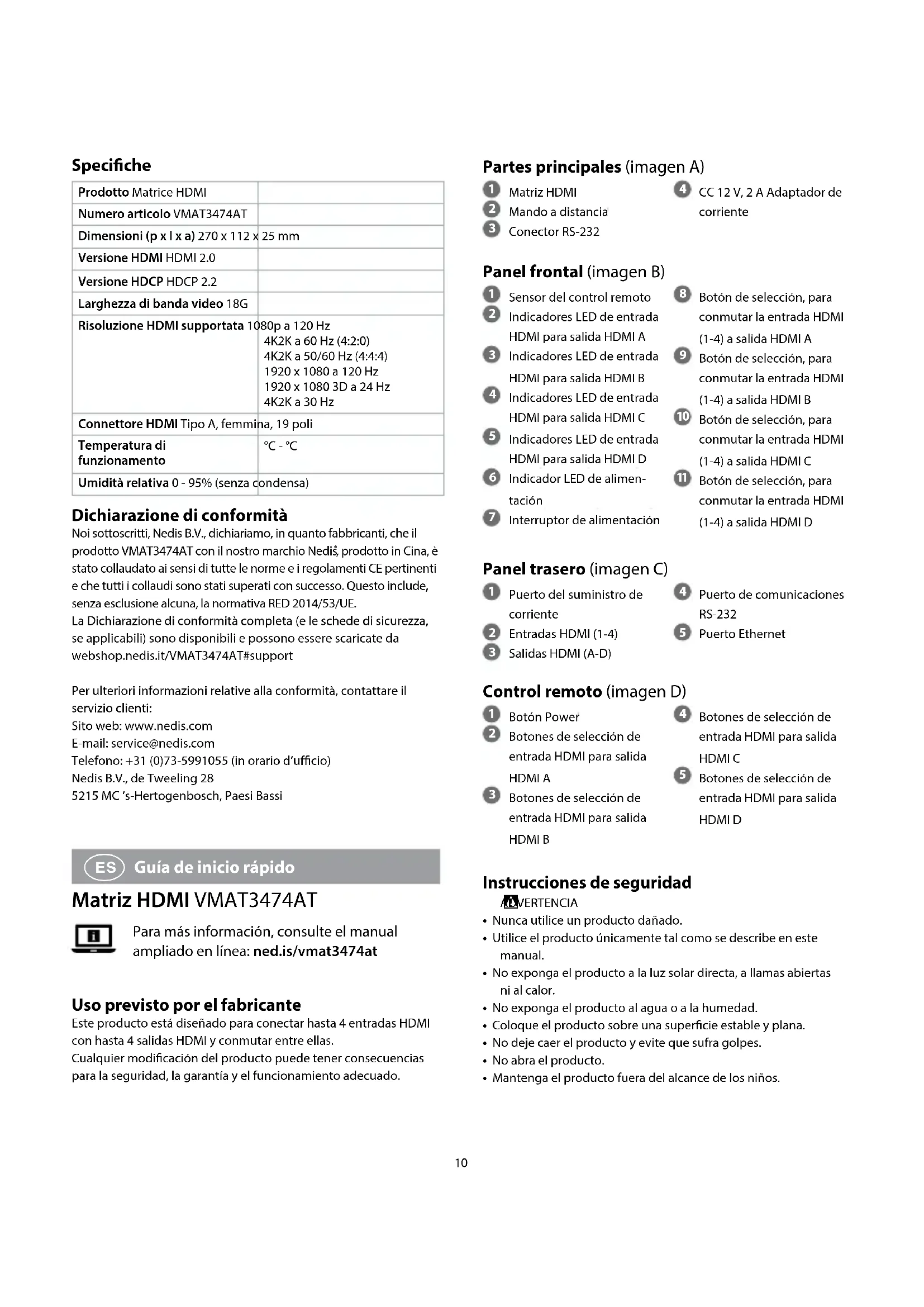 Guía de inicio rápido Matriz HDMI VMAT3474AT Para más información, consulte el manual ampliado en línea: ned.is/vmat3474at Uso previsto por el fabricante Este producto está diseñado para conectar hasta 4 entradas HDMI con hasta 4 salidas HDMI y conmutar entre ellas.Cualquier modicación del producto puede tener consecuencias para la seguridad, la garantía y el funcionamiento adecuado.11 Declaración de conformidad Nosotros, Nedis B.V., declaramos como fabricante que el producto VMAT3474AT de nuestra marca Nedis