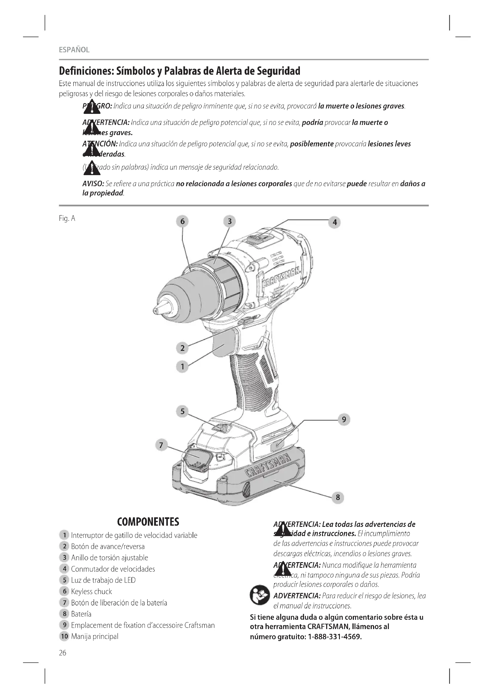 ADVERTENCIA: Nunca modifique la herramienta eléctrica, ni tampoco ninguna de sus piezas. Podría producir lesiones corporales odaños. ADVERTENCIA: Para reducir el riesgo de lesiones, lea el manual deinstrucciones. Si tiene alguna duda o algún comentario sobre ésta u otra herramienta CRAFTSMAN, llámenos al número gratuito: 1-888-331-4569.