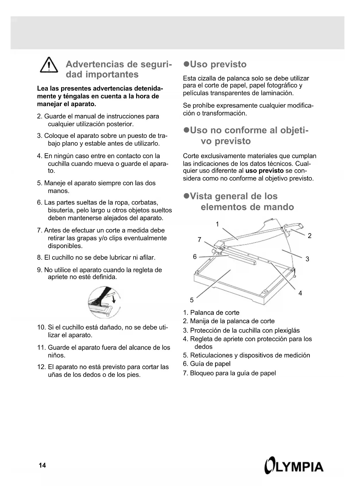 uñas de los dedos o de los pies. Uso previsto Esta cizalla de palanca solo se debe utilizar para el corte de papel, papel fotográfico y películas transparentes de laminación. Se prohíbe expresamente cualquier modifica ción o transformación. Uso no conforme al objeti vo previsto Corte exclusivamente materiales que cumplan las indicaciones de los datos técnicos. Cual quier uso diferente al uso previsto se con sidera como no conforme al objetivo previsto. Vista general de los elementos de mando