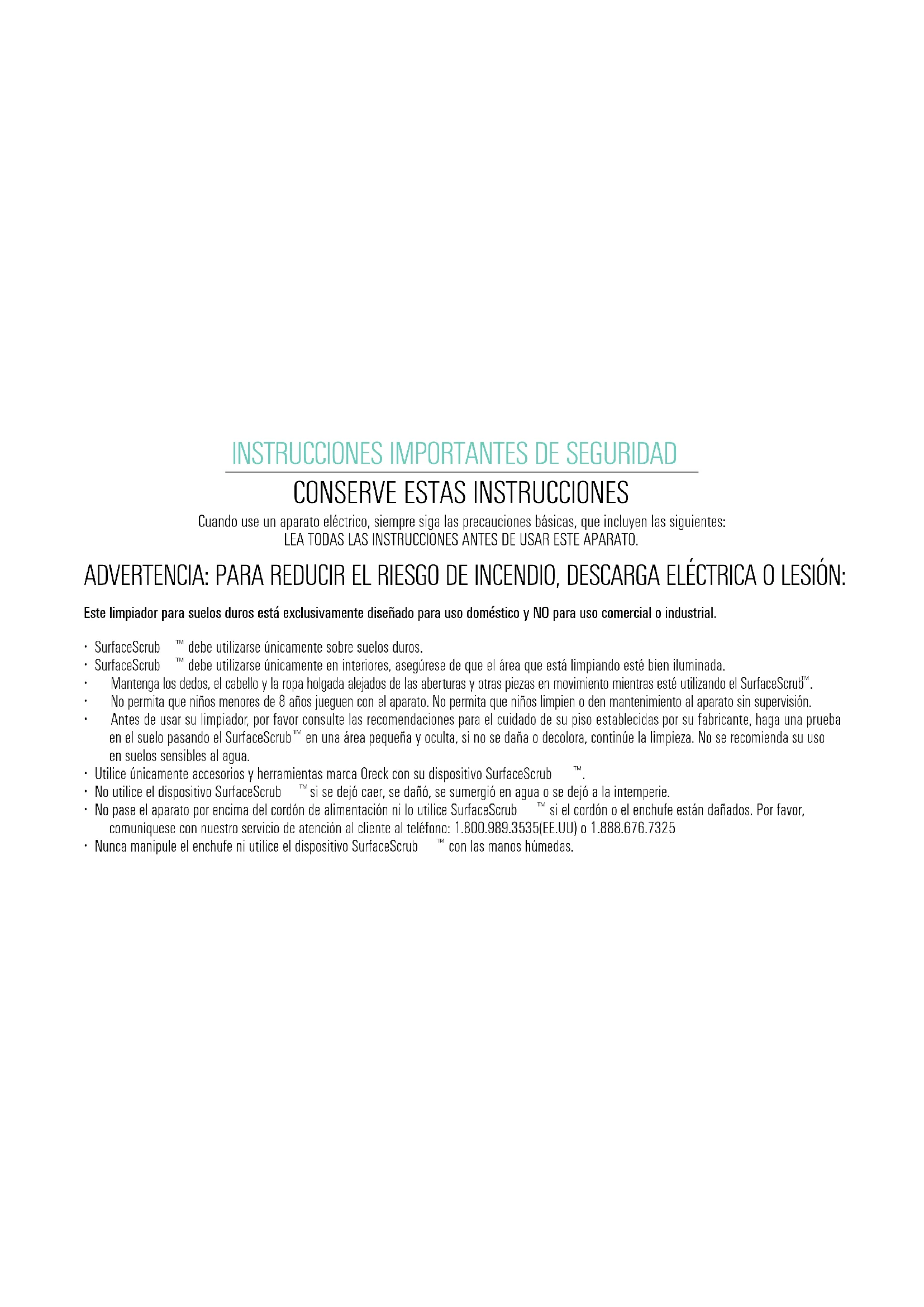 - Revise que los cepillos no estén obstruidos.5. GARANTÍA Techtronic Floor Care Technology le ofrece la siguiente garantía limitada para este producto únicamente si el mismo ha sido comprado originalmente para uso residencial, no para reventa, por Oreck o por un distribuidor minorista autorizado de Oreck. Oreck reparará o reemplazará, sin cargo alguno al comprador original, cualquier pieza que se encuentre defectuosa en cuanto al material o a la mano de obra durante tres (3) años a partir de la fecha de compra, para todos los modelos residenciales. NOTA: La garantía se anula si se utiliza en un entorno comercial. Esta garantía limitada no cubre el reemplazo de piezas fungibles o consumibles como filtros, cartuchos y otras piezas sujetas al desgaste normal, a menos que estén defectuosas en cuanto al material o a la mano de obra. Esta garantía limitada no se aplica a ninguna pieza sujeta a accidente, maltrato, uso comercial, alteración, uso indebido, daño causado por hechos de fuerza mayor, uso de tensiones eléctricas distintas a las indicadas en la placa de datos de este producto, o servicio de este producto que no haya sido realizado por Oreck o un centro de servicio participante, autorizado por la fábrica. Oreck no autoriza a ninguna persona o representante a asumir u otorgar cualquier otra obligación de garantía junto con la venta de este producto. La garantía limitada de Oreck es válida únicamente si usted retiene el comprobante de la compra de Oreck o de un distribuidor minorista autorizado por Oreck para este producto. Si usted compra este producto a través de otro proveedor, su compra es “TAL CUAL,” lo que significa que Oreck no le otorga ninguna garantía, y que usted, y no Oreck, asume en su totalidad el riesgo de la calidad y el desempeño de este producto, incluyendo el costo total de cualquier servicio o reparación de cualquier defecto, en caso de ser necesario. La responsabilidad de Oreck hacia usted por daños, costo de cualquier tipo que surja de esta declaración de garantía limitada se limitará a la cantidad pagada por este producto al momento de su compra original y Oreck no será responsable por ningún daño directo, indirecto, incidental o consiguiente que resulte por la inhabilidad o el uso de este producto. Algunos estados no permiten la exclusión o limitación de los daños incidentales o consiguientes, por lo que la limitación o exclusión indicada puede no ser aplicable en su caso. SE DENIEGAN EXPRESAMENTE TODAS LAS GARANTÍAS EXPRESAS E IMPLÍCITAS PARA ESTE PRODUCTO EXCEPTO LA GARANTÍA LIMITADA ESTABLECIDA ANTERIORMENTE, CON INCLUSIÓN DE LAS GARANTÍAS IMPLÍCITAS DE COMERCIABILIDAD Y ADECUACIÓN PARA UN PROPÓSITO PARTICULAR. Esta garantía le proporciona derechos legales específicos y es posible que usted cuente también con otros derechos que varían de un estado a otro.ORECK SURFACESCRUB
