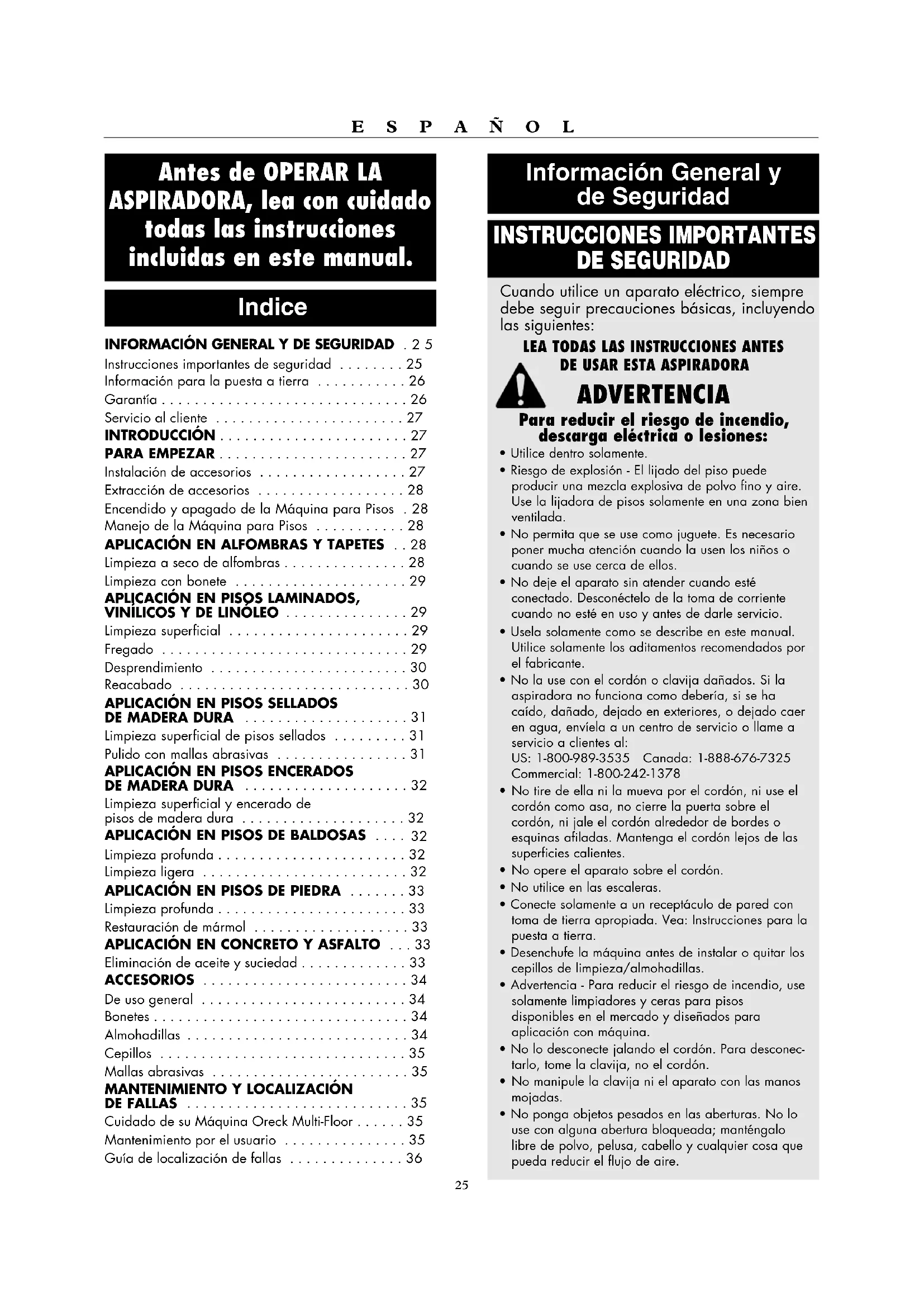 Cuidado de su Máquina Oreck Multi-Floor . . . . . . 35 Mantenimiento por el usuario . . . . . . . . . . . . . . . 35 Guía de localización de fallas . . . . . . . . . . . . . . 36 Cuando utilice un aparato eléctrico, siempre debe seguir precauciones básicas, incluyendo las siguientes: