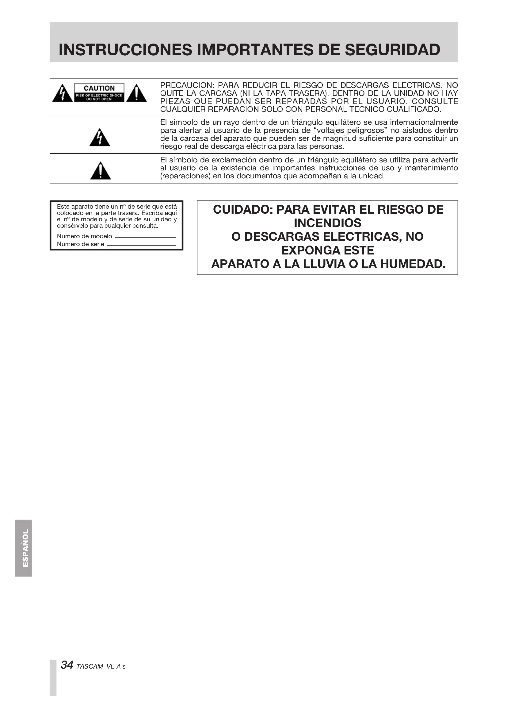 - El aparato consume una energía no operacional nominal del tomacorriente de CA con su interruptor STANDBY/ON en la posición de espera.36 TASCAM VL-A's
