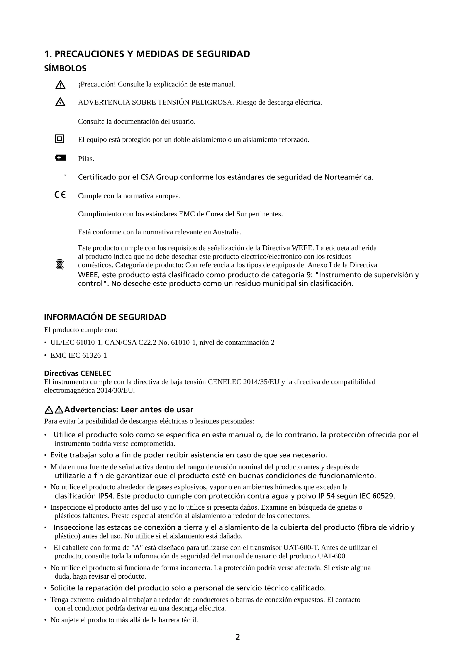 - EMC IEC 61326-1 Directivas CENELEC El instrumento cumple con la directiva de baja tensión CENELEC 2014/35/EU y la directiva de compatibilidad electromagnética 2014/30/EU. Advertencias: Leer antes de usar Para evitar la posibilidad de descargas eléctricas o lesiones personales: