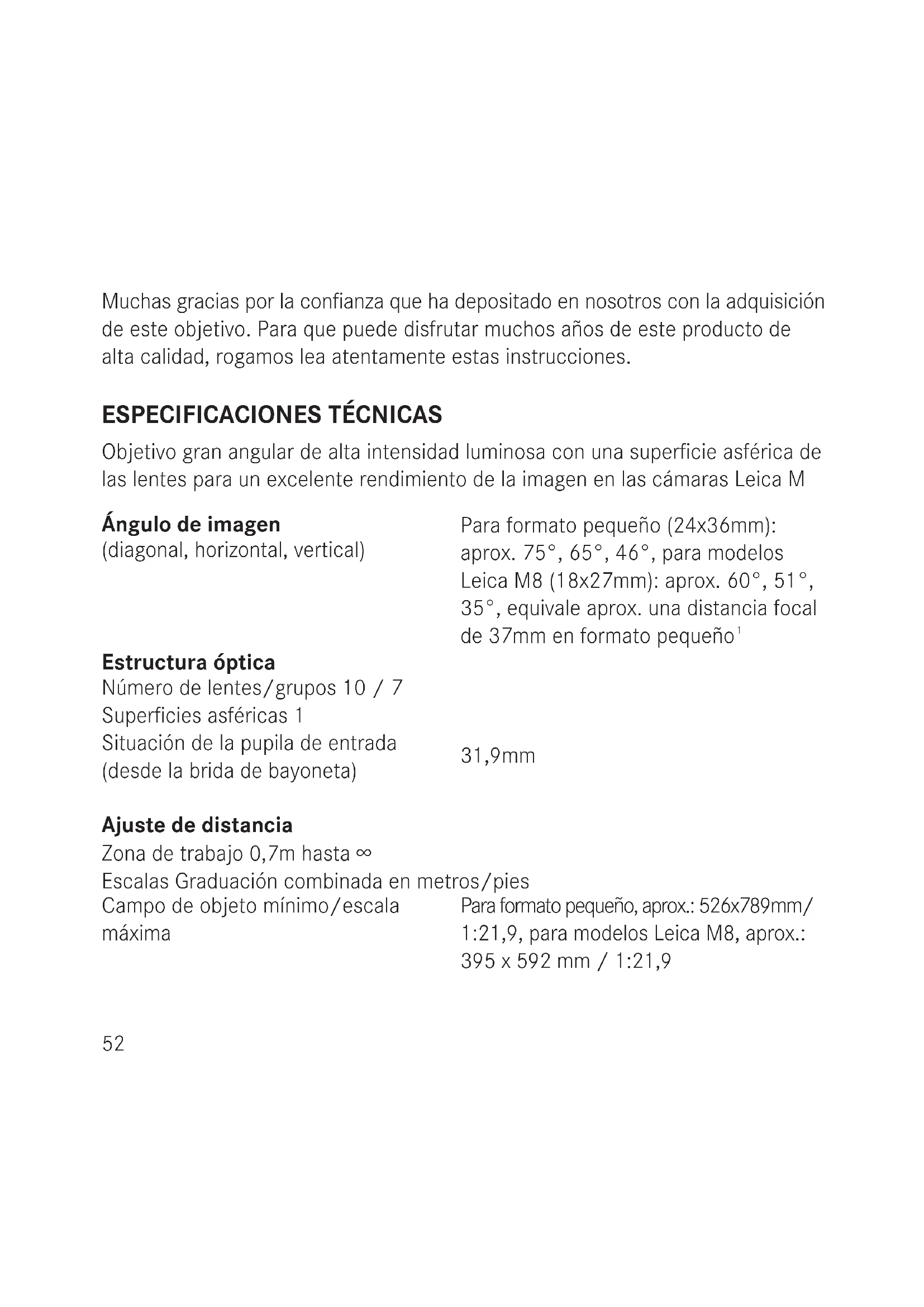 Estructura óptica Número de lentes/grupos 10 / 7 Superficies asféricas 1 Situación de la pupila de entrada (desde la brida de bayoneta) 31,9mm Ajuste de distancia Zona de trabajo 0,7m hasta ∞ Escalas Graduación combinada en metros/pies Campo de objeto mínimo/escala máxima Para formato pequeño, aprox.: 526x789mm/ 1:21,9, para modelos Leica M8, aprox.: 395 x 592 mm / 1:21,9