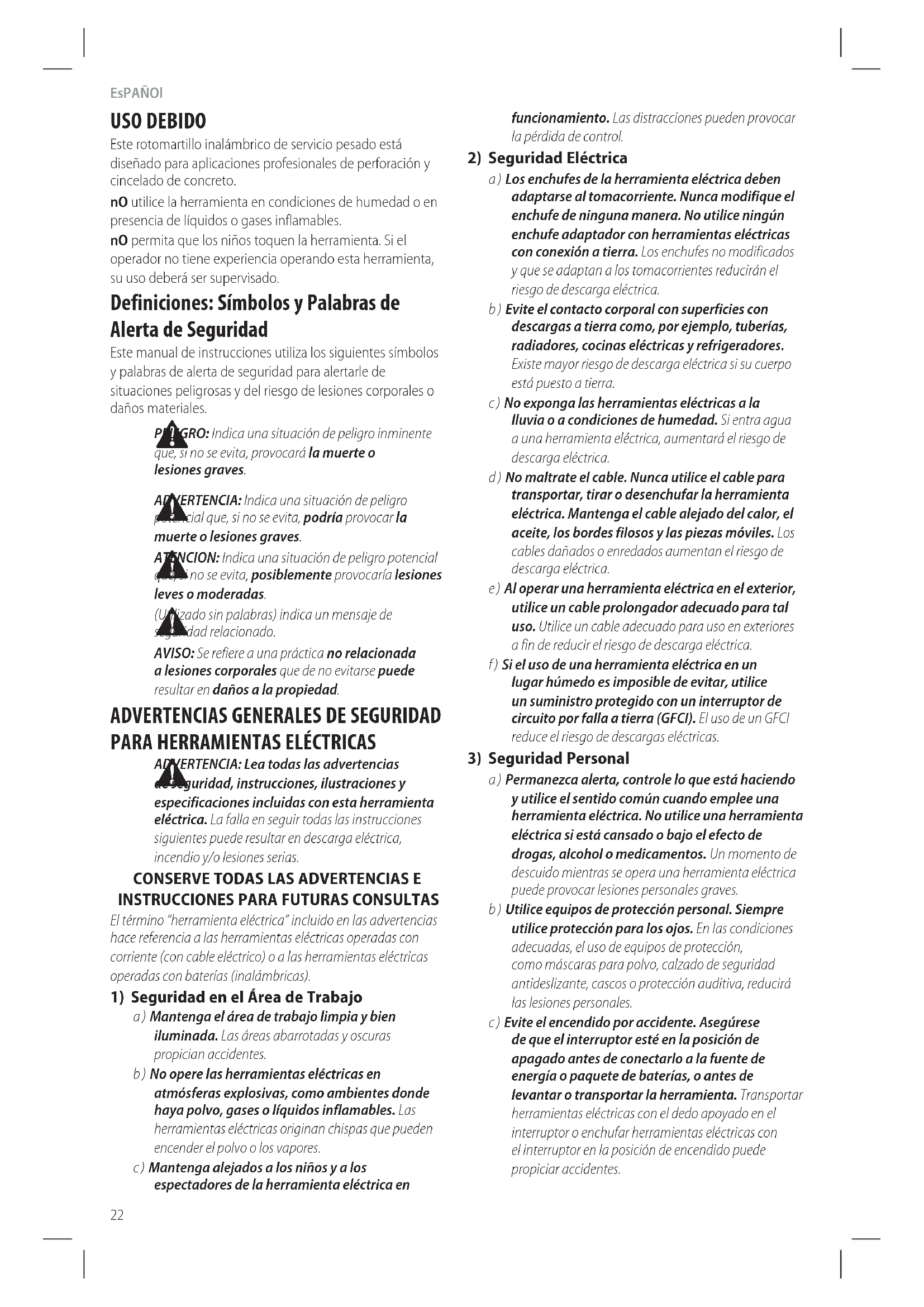 a ) Mantenga el área de trabajo limpia y bien iluminada. Las áreas abarrotadas y oscuras propicianaccidentes. b ) No opere las herramientas eléctricas en atmósferas explosivas, como ambientes donde haya polvo, gases o líquidos inflamables. Las herramientas eléctricas originan chispas que pueden encender el polvo o losvapores. c ) Mantenga alejados a los niños y a los espectadores de la herramienta eléctrica en Definiciones: Símbolos y Palabras de Alerta de Seguridad Este manual de instrucciones utiliza los siguientes símbolos y palabras de alerta de seguridad para alertarle de situaciones peligrosas y del riesgo de lesiones corporales o dañosmateriales.