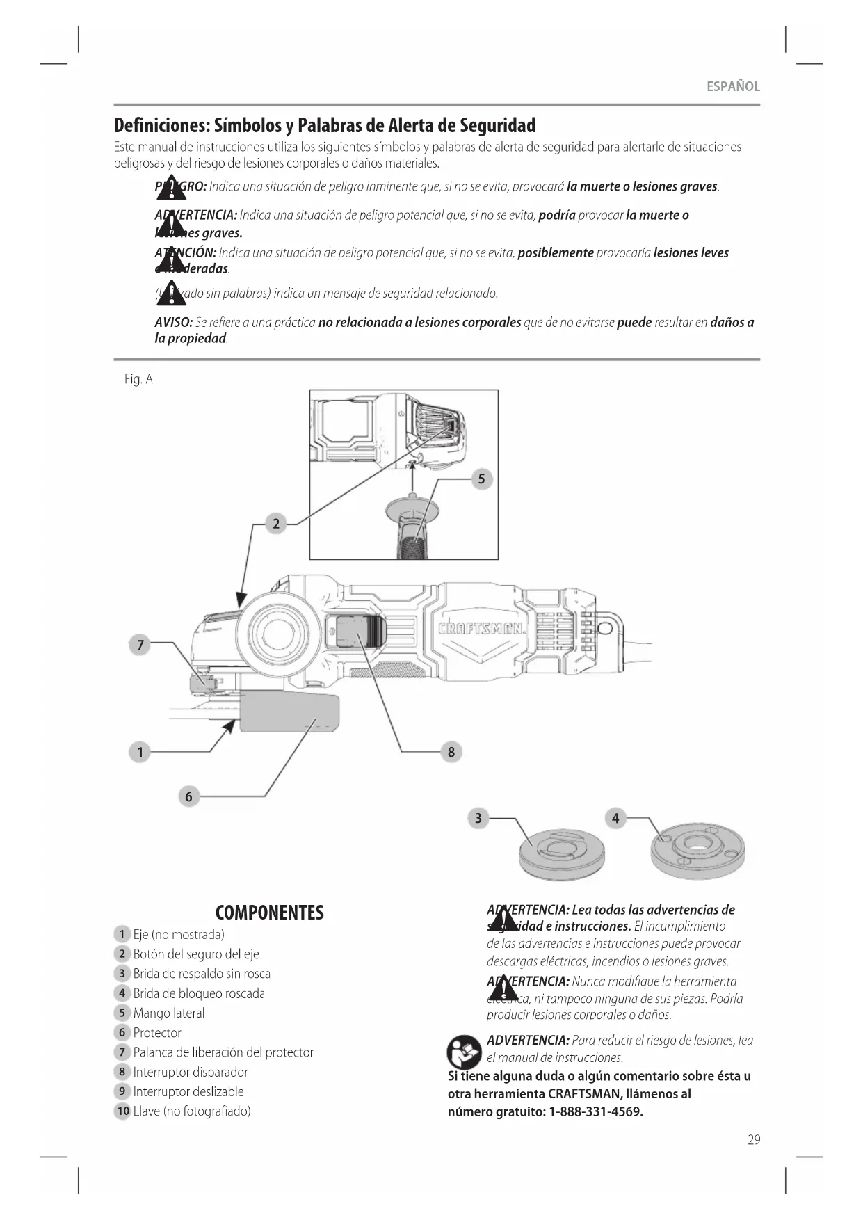 ADVERTENCIA: Nunca modifique la herramienta eléctrica, ni tampoco ninguna de sus piezas. Podría producir lesiones corporales odaños. ADVERTENCIA: Para reducir el riesgo de lesiones, lea el manual deinstrucciones. Si tiene alguna duda o algún comentario sobre ésta u otra herramienta CRAFTSMAN, llámenos al número gratuito: 1-888-331-4569.EsPAñOl