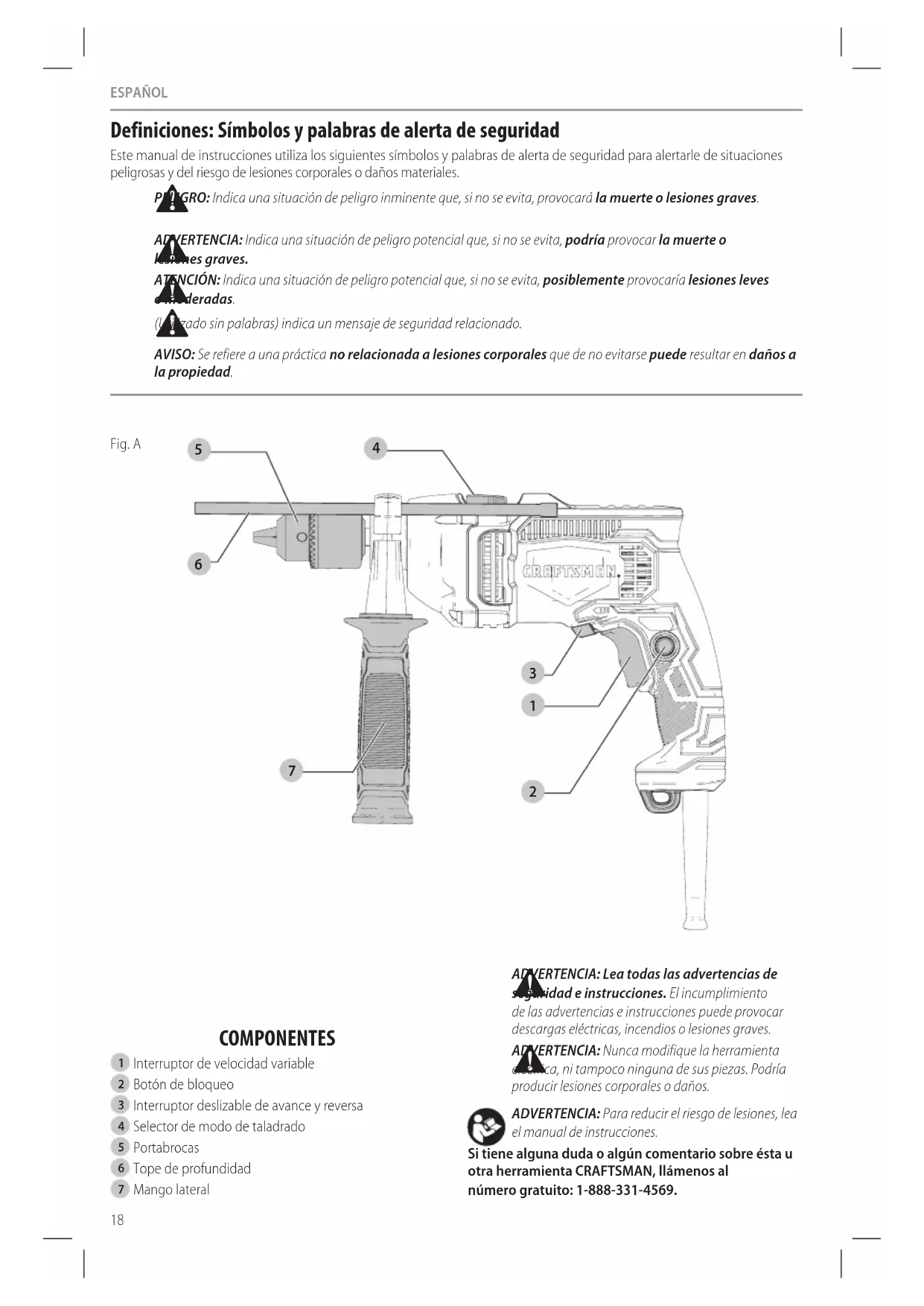 ADVERTENCIA: Nunca modifique la herramienta eléctrica, ni tampoco ninguna de sus piezas. Podría producir lesiones corporales odaños. ADVERTENCIA: Para reducir el riesgo de lesiones, lea el manual deinstrucciones. Si tiene alguna duda o algún comentario sobre ésta u otra herramienta CRAFTSMAN, llámenos al número gratuito: 1-888-331-4569. Fig. A COMPONENTES