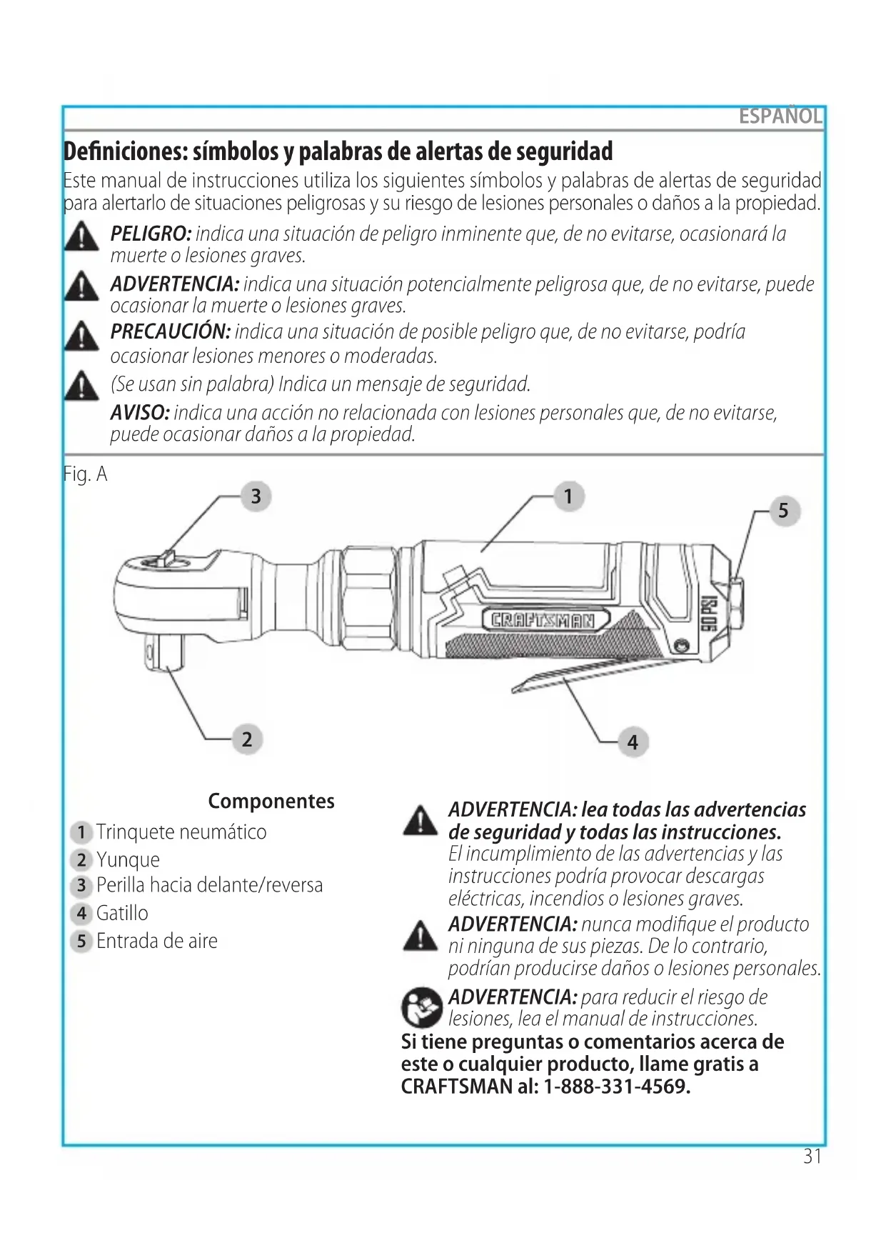 ESPAÑOL Definiciones: símbolos y palabras de alertas de seguridad Este manual de instrucciones utiliza los siguientes símbolos y palabras de alertas de seguridad para alertarlo de situaciones peligrosas y su riesgo de lesiones personales o daños a la propiedad. PELIGRO: indica una situación de peligro inminente que, de no evitarse, ocasionará la muerte o lesiones graves. ADVERTENCIA: indica una situación potencialmente peligrosa que, de no evitarse, puede ocasionar la muerte o lesiones graves. PRECAUCIÓN: indica una situación de posible peligro que, de no evitarse, podría ocasionar lesiones menores o moderadas. AVISO: indica una acción no relacionada con lesiones personales que, de no evitarse, puede ocasionar daños a la propiedad. (Se usan sin palabra) Indica un mensaje de seguridad. ADVERTENCIA: lea todas las advertencias de seguridad y todas las instrucciones. El incumplimiento de las advertencias y las instrucciones podría provocar descargas eléctricas, incendios o lesiones graves. ADVERTENCIA: nunca modifique el producto ni ninguna de sus piezas. De lo contrario, podrían producirse daños o lesiones personales. ADVERTENCIA: para reducir el riesgo de lesiones, lea el manual de instrucciones. Si tiene preguntas o comentarios acerca de este o cualquier producto, llame gratis a CRAFTSMAN al: 1-888-331-4569.Especificaciones Modelo CMXPTSG1007NB Llave cuadrada 3/8" (9,52 mm) Velocidad sin carga 180 rpm Torque máximo 6,91 kgm Consumo de aire promedio 4,4 scfm Entrada de aire NPT de 1/4" Manguera de aire comprimido 3/8" (9,52 mm) Presión de trabajo 90 psi Trinquete neumático de 3/8 pulg. CMXPTSG1007NB Requerimientos del compresor