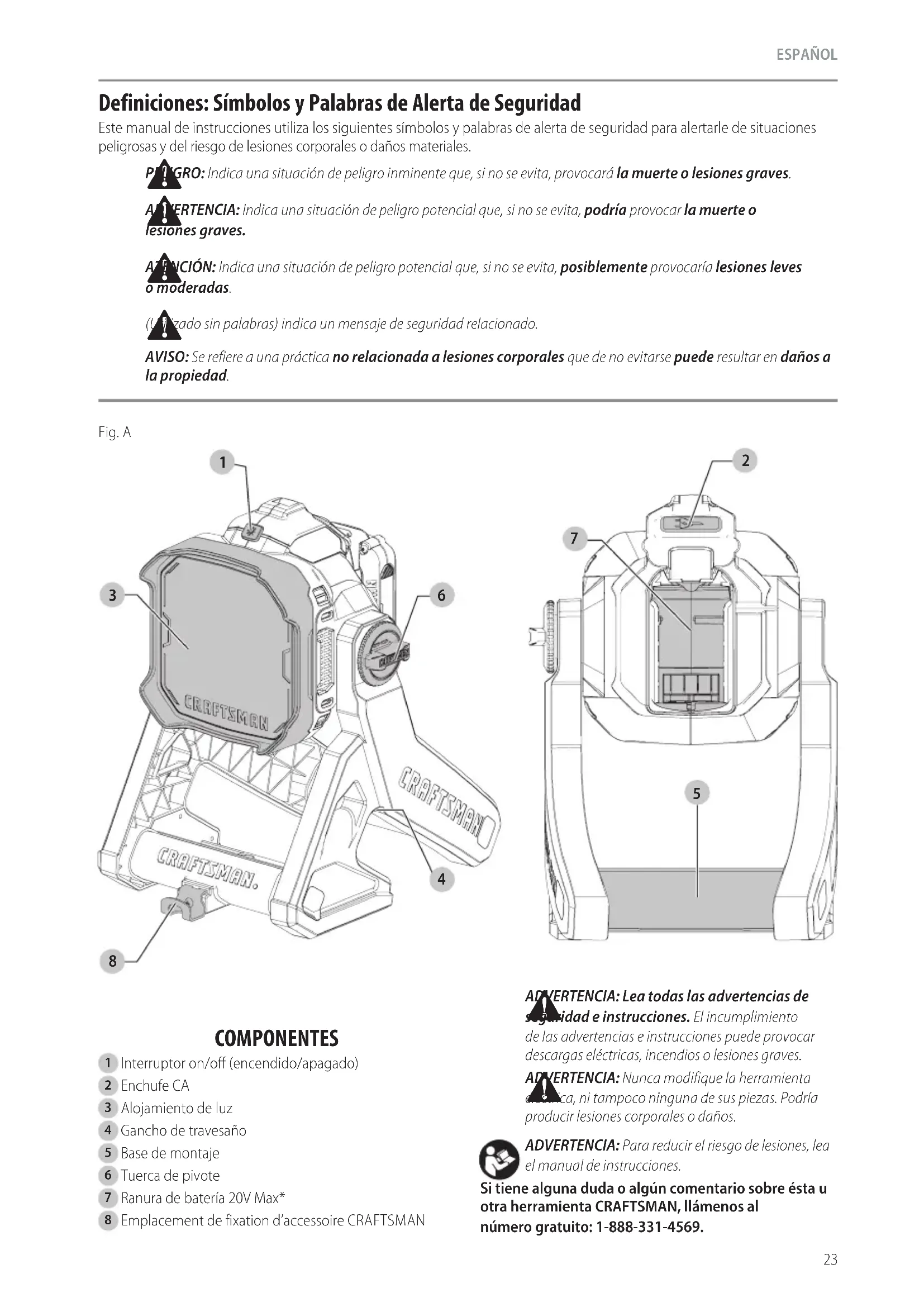 ADVERTENCIA: Nunca modifique la herramienta eléctrica, ni tampoco ninguna de sus piezas. Podría producir lesiones corporales odaños. ADVERTENCIA: Para reducir el riesgo de lesiones, lea el manual deinstrucciones. Si tiene alguna duda o algún comentario sobre ésta u otra herramienta CRAFTSMAN, llámenos al número gratuito: 1-888-331-4569. COMPONENTES