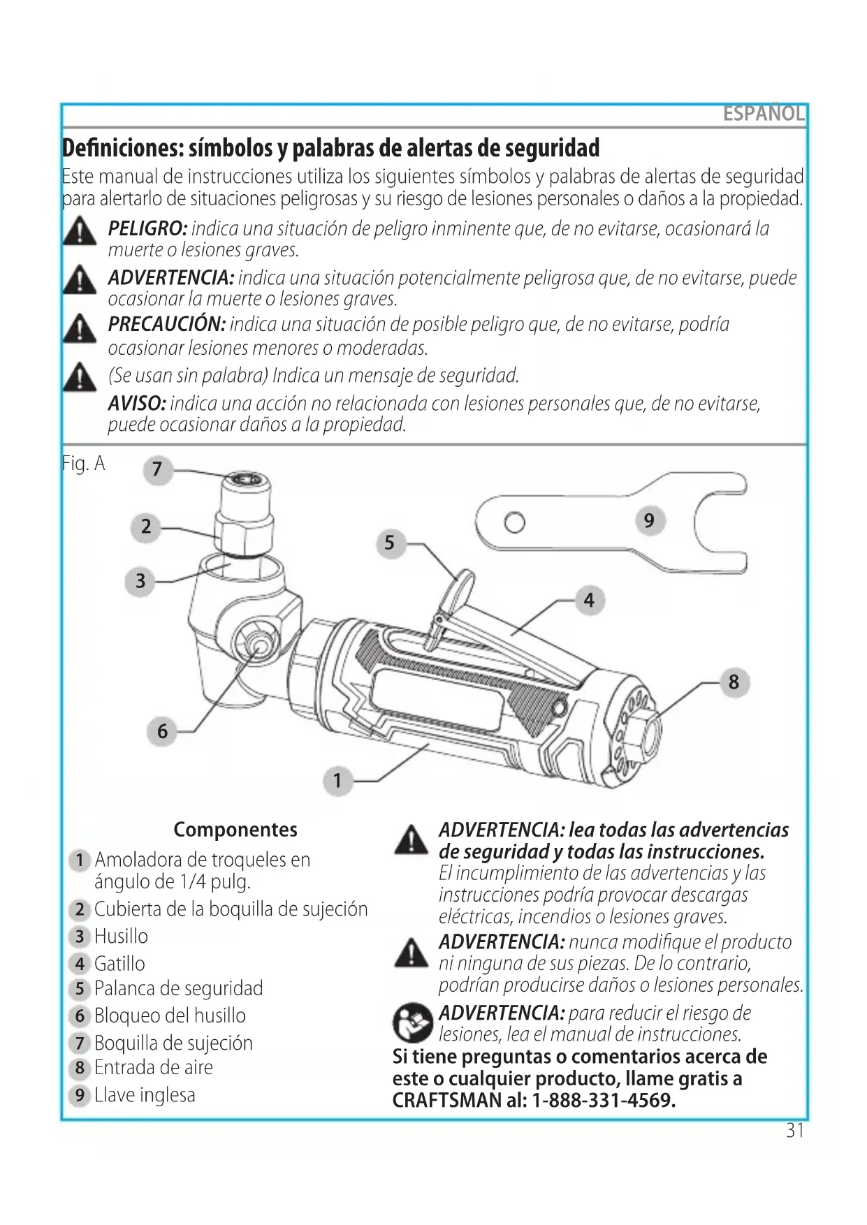 Llave inglesa Fig. A Definiciones: símbolos y palabras de alertas de seguridad Este manual de instrucciones utiliza los siguientes símbolos y palabras de alertas de seguridad para alertarlo de situaciones peligrosas y su riesgo de lesiones personales o daños a la propiedad. PELIGRO: indica una situación de peligro inminente que, de no evitarse, ocasionará la muerte o lesiones graves. ADVERTENCIA: indica una situación potencialmente peligrosa que, de no evitarse, puede ocasionar la muerte o lesiones graves. PRECAUCIÓN: indica una situación de posible peligro que, de no evitarse, podría ocasionar lesiones menores o moderadas. AVISO: indica una acción no relacionada con lesiones personales que, de no evitarse, puede ocasionar daños a la propiedad. (Se usan sin palabra) Indica un mensaje de seguridad. ADVERTENCIA: lea todas las advertencias de seguridad y todas las instrucciones. El incumplimiento de las advertencias y las instrucciones podría provocar descargas eléctricas, incendios o lesiones graves. ADVERTENCIA: nunca modifique el producto ni ninguna de sus piezas. De lo contrario, podrían producirse daños o lesiones personales. ADVERTENCIA: para reducir el riesgo de lesiones, lea el manual de instrucciones. Si tiene preguntas o comentarios acerca de este o cualquier producto, llame gratis a CRAFTSMAN al: 1-888-331-4569.
