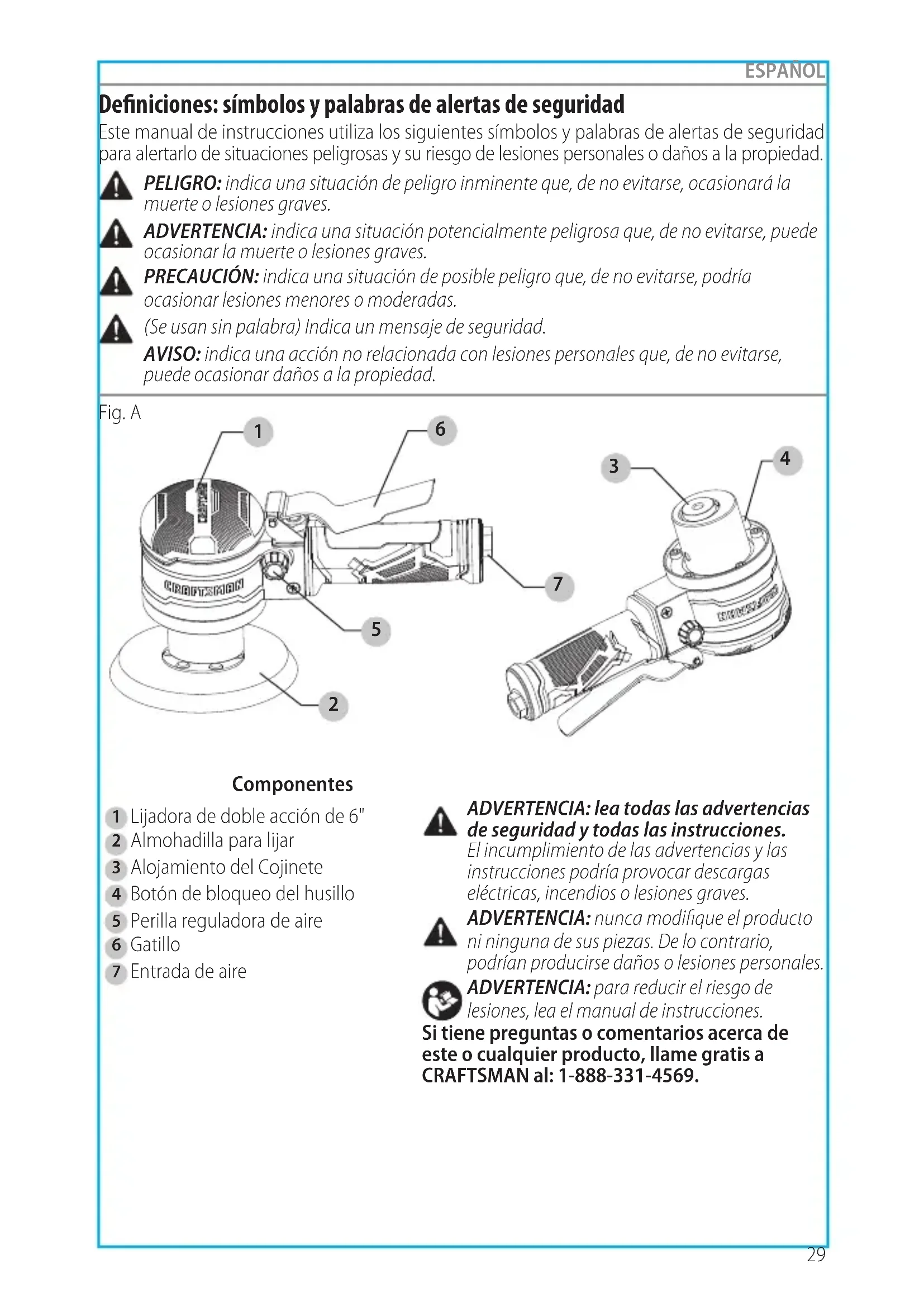 Definiciones: símbolos y palabras de alertas de seguridad Este manual de instrucciones utiliza los siguientes símbolos y palabras de alertas de seguridad para alertarlo de situaciones peligrosas y su riesgo de lesiones personales o daños a la propiedad. PELIGRO: indica una situación de peligro inminente que, de no evitarse, ocasionará la muerte o lesiones graves. ADVERTENCIA: indica una situación potencialmente peligrosa que, de no evitarse, puede ocasionar la muerte o lesiones graves. PRECAUCIÓN: indica una situación de posible peligro que, de no evitarse, podría ocasionar lesiones menores o moderadas. AVISO: indica una acción no relacionada con lesiones personales que, de no evitarse, puede ocasionar daños a la propiedad. (Se usan sin palabra) Indica un mensaje de seguridad. ADVERTENCIA: lea todas las advertencias de seguridad y todas las instrucciones. El incumplimiento de las advertencias y las instrucciones podría provocar descargas eléctricas, incendios o lesiones graves. ADVERTENCIA: nunca modifique el producto ni ninguna de sus piezas. De lo contrario, podrían producirse daños o lesiones personales. ADVERTENCIA: para reducir el riesgo de lesiones, lea el manual de instrucciones. Si tiene preguntas o comentarios acerca de este o cualquier producto, llame gratis a CRAFTSMAN al: 1-888-331-4569.Especificaciones Modelo CMXPTSG1014NB Almohadilla para lijar 6" (152,4 mm) Velocidad sin carga 10.000 rpm Consumo de aire promedio 5,2 scfm Entrada de aire NPT de 1/4" Manguera de aire comprimido 3/8" (9,52 mm) Presión de trabajo 90 psi Lijadora de doble acción de 6"