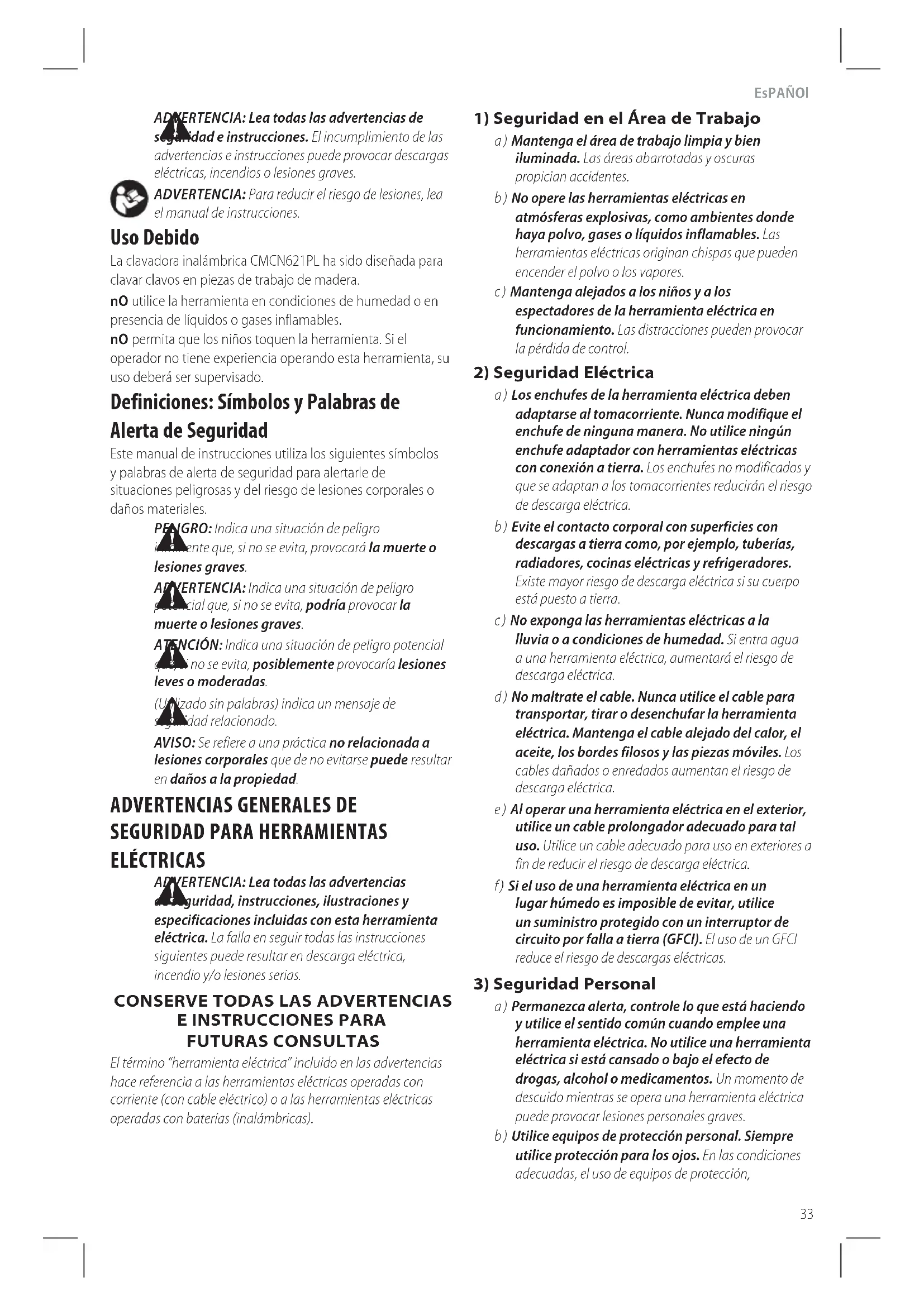 ADVERTENCIA: Al utilizar una clavadora, deben seguirse todas las precauciones de seguridad descritas a continuación, a fin de evitar el riesgo de muerte o lesiones graves. Lea y comprenda todas las instrucciones antes de emplear laherramienta.