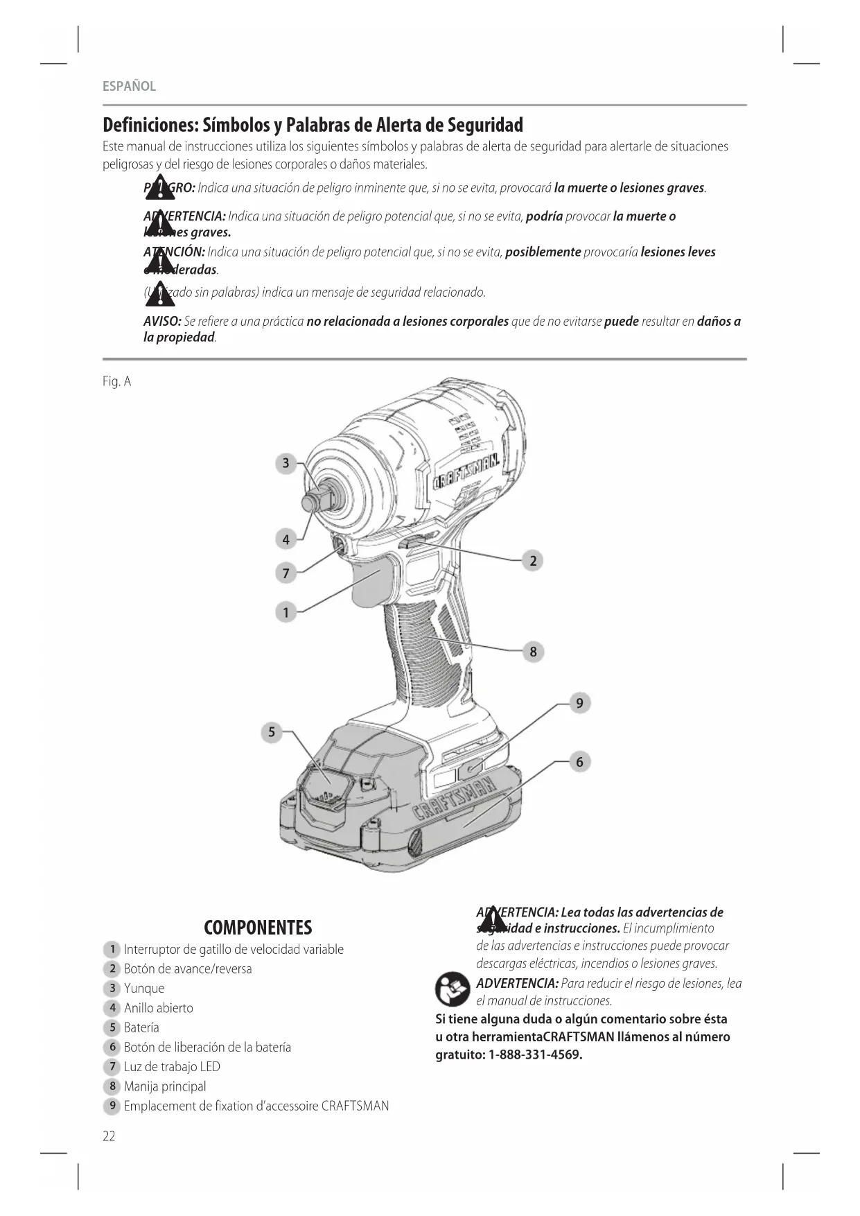 ADVERTENCIA: Lea todas las advertencias de seguridad e instrucciones. El incumplimiento de las advertencias e instrucciones puede provocar descargas eléctricas, incendios o lesionesgraves. ADVERTENCIA: Para reducir el riesgo de lesiones, lea el manual deinstrucciones. Si tiene alguna duda o algún comentario sobre ésta u otra herramientaCRAFTSMAN llámenos al número gratuito: 1-888-331-4569. Español (traducido de las instrucciones originales) Fig. A
