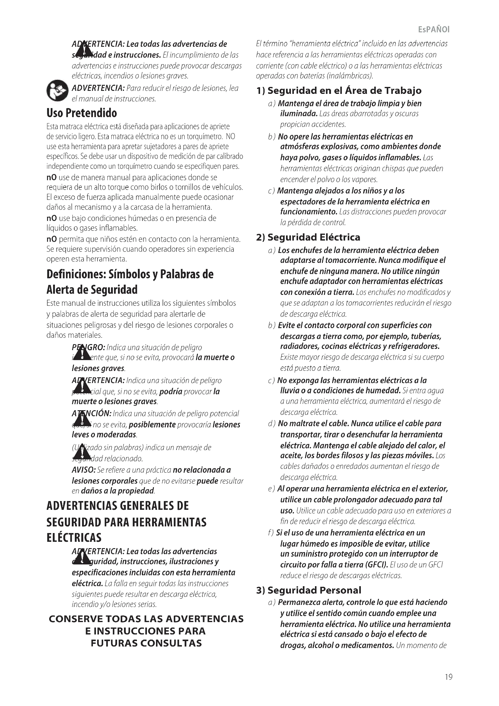 (Utilizado sin palabras) indica un mensaje de seguridadrelacionado. AVISO: Se refiere a una práctica no relacionada a lesiones corporales que de no evitarse puede resultar en daños a lapropiedad. Uso Pretendido Esta matraca eléctrica está diseñada para aplicaciones de apriete de servicio ligero. Esta matraca eléctrica no es un torquímetro. NO use esta herramienta para apretar sujetadores a pares de apriete específicos. Se debe usar un dispositivo de medición de par calibrado independiente como un torquímetro cuando se especifiquen pares. nO use de manera manual para aplicaciones donde se requiera de un alto torque como birlos o tornillos de vehículos. El exceso de fuerza aplicada manualmente puede ocasionar daños al mecanismo y a la carcasa de la herramienta. nO use bajo condiciones húmedas o en presencia de líquidos o gases inflamables. nO permita que niños estén en contacto con la herramienta. Se requiere supervisión cuando operadores sin experiencia operen esta herramienta. Español (traducido de las instrucciones originales)
