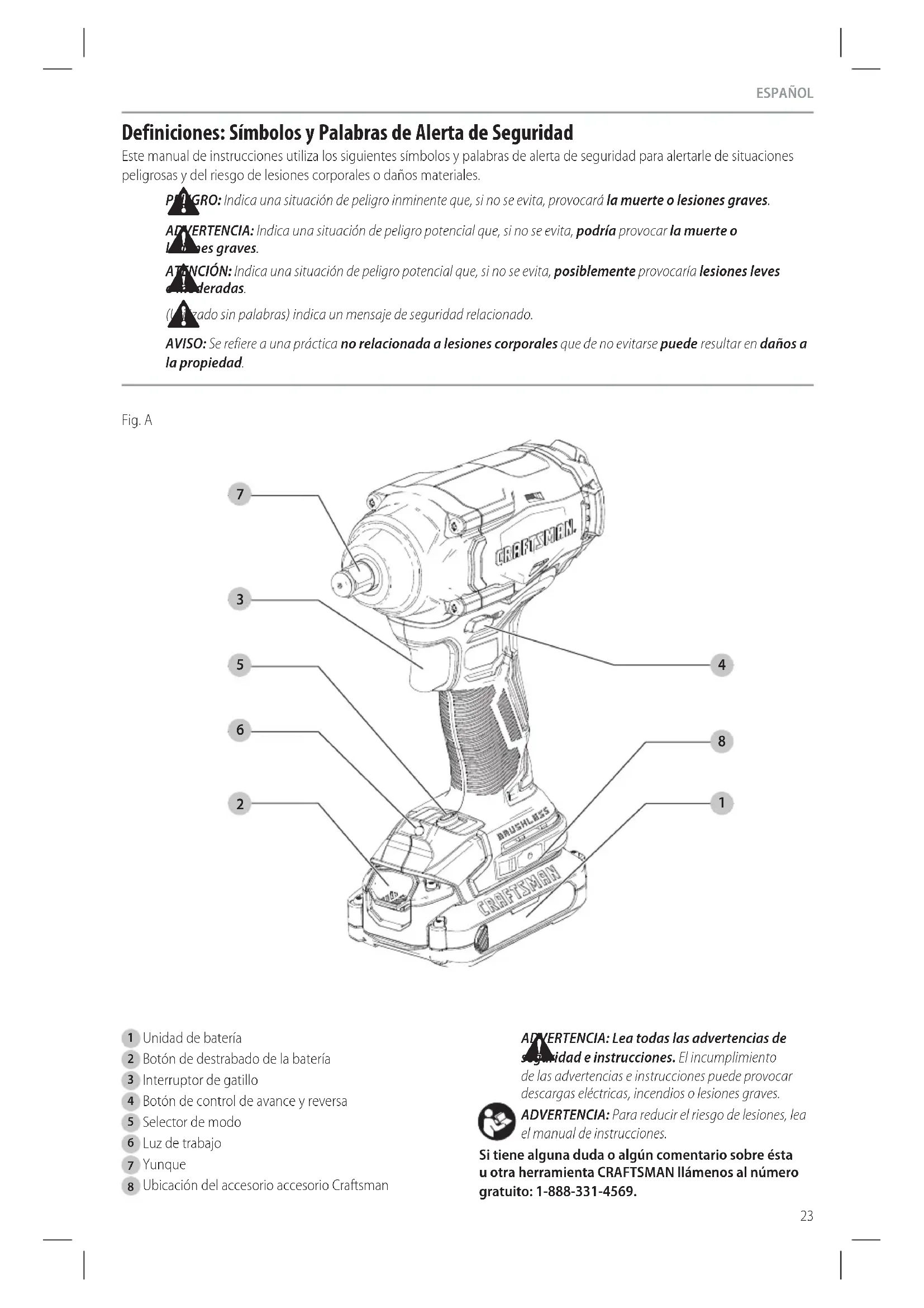 ADVERTENCIA: Lea todas las advertencias de seguridad e instrucciones. El incumplimiento de las advertencias e instrucciones puede provocar descargas eléctricas, incendios o lesionesgraves. ADVERTENCIA: Para reducir el riesgo de lesiones, lea el manual deinstrucciones. Si tiene alguna duda o algún comentario sobre ésta u otra herramienta CRAFTSMAN llámenos al número gratuito: 1-888-331-4569.
