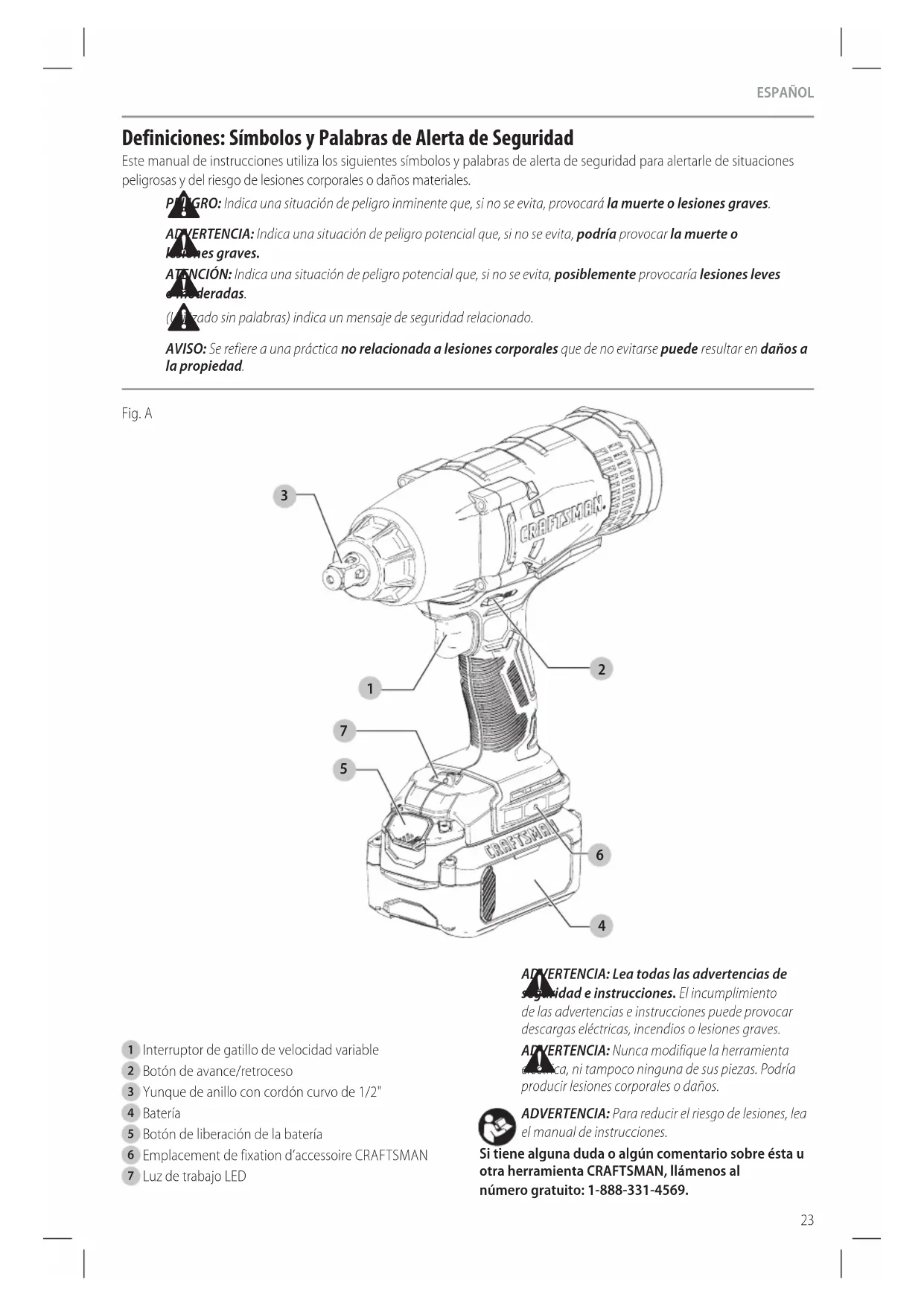 ADVERTENCIAS: Si sus etiquetas de advertencia se vuelven ilegibles o faltan, llame al 1-888-331-4569 para que se le reemplacengratuitamente. Garantía Limitada por Tres Años CRAFTSMAN reparará o reemplazará, sin cargo, cualquier defecto debido a materiales o mano de obra defectuosos por tres años desde la fecha de compra (dos años para las baterías). Esta garantía no cubre falla de partes debido al desgaste normal o abuso de la herramienta. Para detalles adicionales de la cobertura de la garantía e información de reparación de garantía, visite www.craftsman.com o llame al 1-888-331-4569. Esta garantía no se aplica a accesorios o daño causado cuando otros hayan realizado o intentado reparaciones. ESTA GARANTÍA LIMITADA SE OTORGA EN LUGAR DE TODAS LAS DEMÁS, INCLUIDA LA GARANTÍA IMPLÍCITA DE COMERCIABILIDAD E IDONEIDAD PARA UN PROPÓSITO EN PARTICULAR, Y EXCLUYE TODOS LOS DAÑOS INCIDENTALES O EN CONSECUENCIA. Algunos estados no permiten limitaciones sobre la duración de una garantía implícita o la exclusión o limitación de daños incidentales o en consecuencia, por lo que estas limitaciones pueden no aplicarse en su caso. Esta garantía le da derechos legales específicos y puede tener otros derechos que varían en ciertos estados o provincias..ESPAÑOL