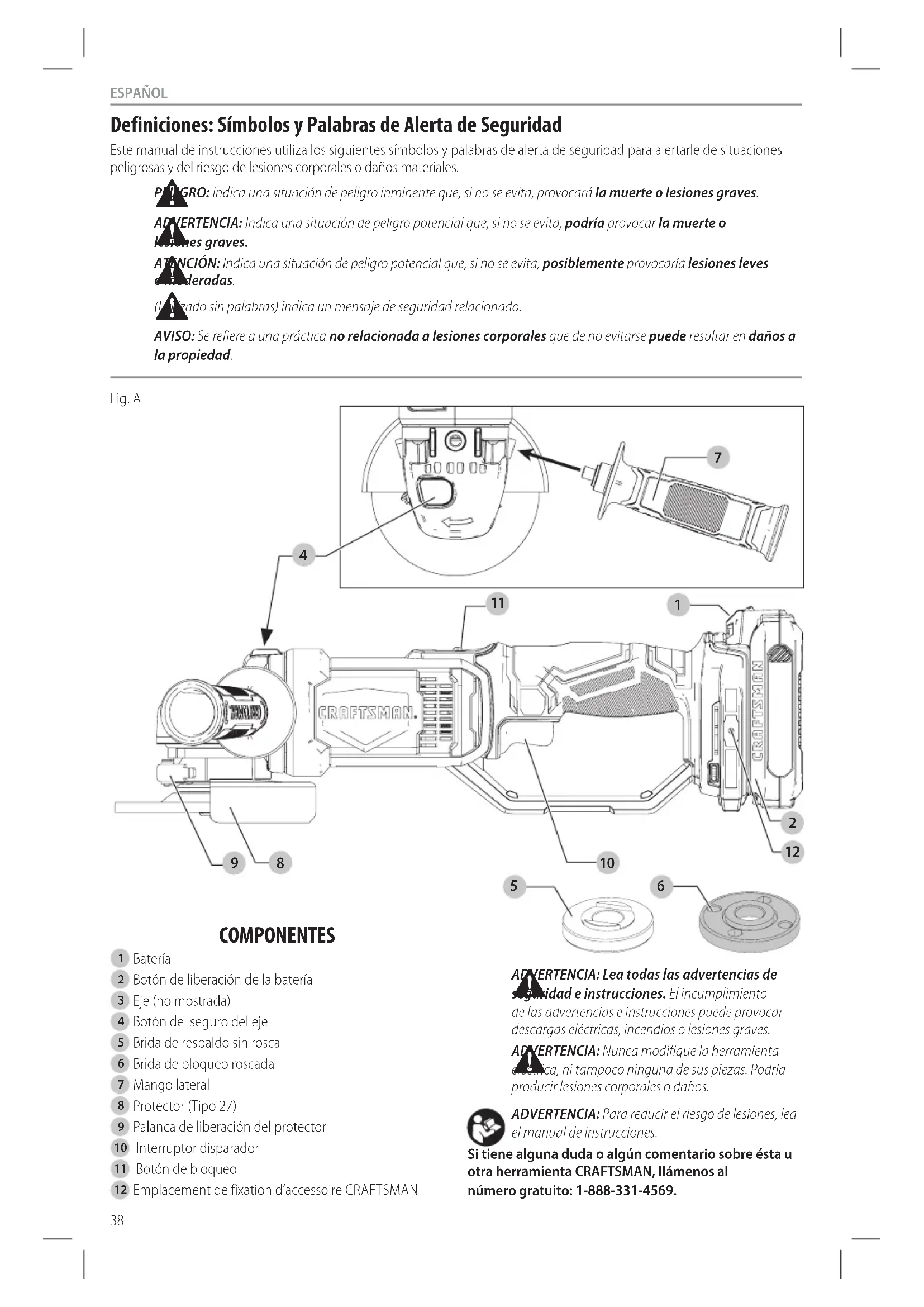 ADVERTENCIA: Nunca modifique la herramienta eléctrica, ni tampoco ninguna de sus piezas. Podría producir lesiones corporales odaños. ADVERTENCIA: Para reducir el riesgo de lesiones, lea el manual deinstrucciones. Si tiene alguna duda o algún comentario sobre ésta u otra herramienta CRAFTSMAN, llámenos al número gratuito: 1-888-331-4569. Fig. A