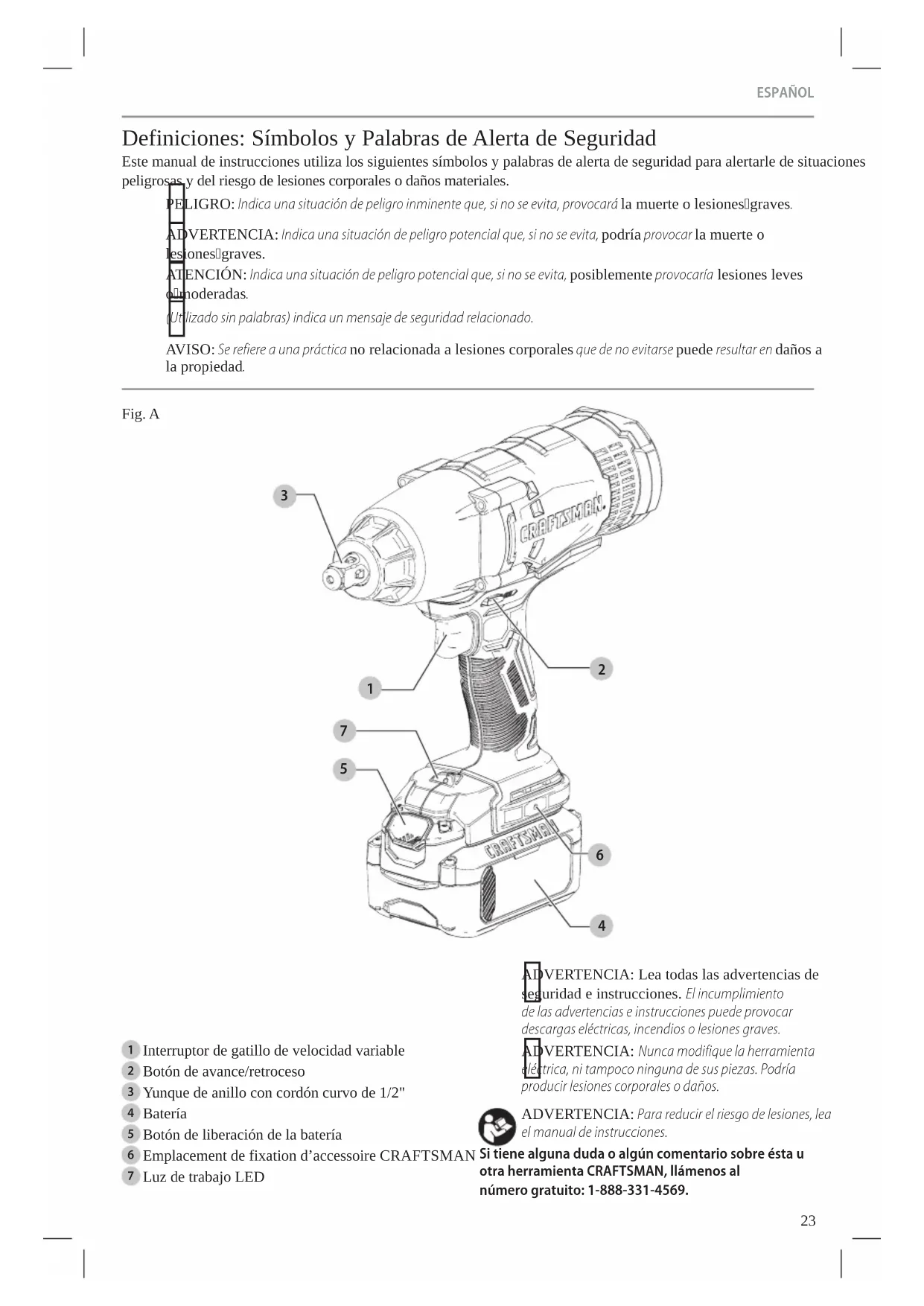 ADVERTENCIA: Nunca modifique la herramienta eléctrica, ni tampoco ninguna de sus piezas. Podría producir lesiones corporales odaños. ADVERTENCIA: Para reducir el riesgo de lesiones, lea el manual deinstrucciones. Si tiene alguna duda o algún comentario sobre ésta u otra herramienta CRAFTSMAN, llámenos al número gratuito: 1-888-331-4569.