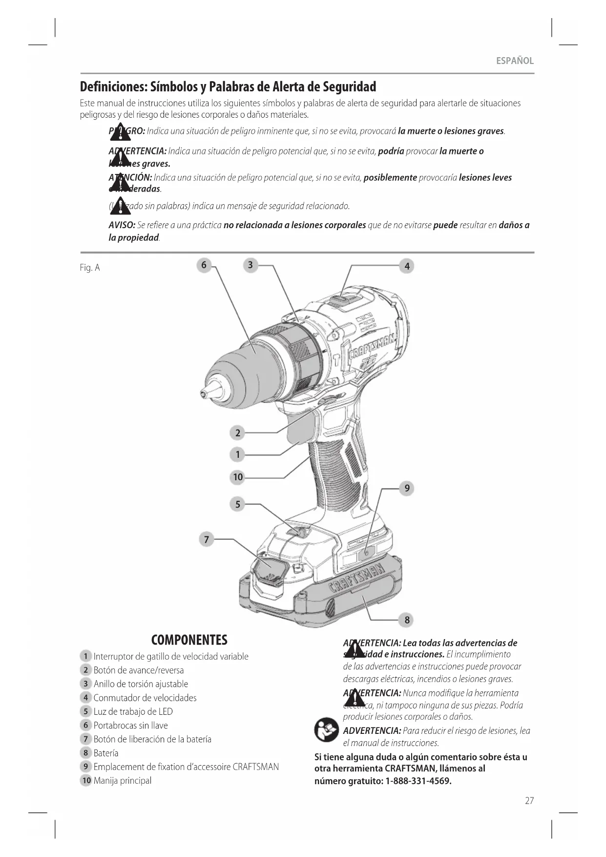 ADVERTENCIA: Nunca modifique la herramienta eléctrica, ni tampoco ninguna de sus piezas. Podría producir lesiones corporales odaños. ADVERTENCIA: Para reducir el riesgo de lesiones, lea el manual deinstrucciones. Si tiene alguna duda o algún comentario sobre ésta u otra herramienta CRAFTSMAN, llámenos al número gratuito: 1-888-331-4569.