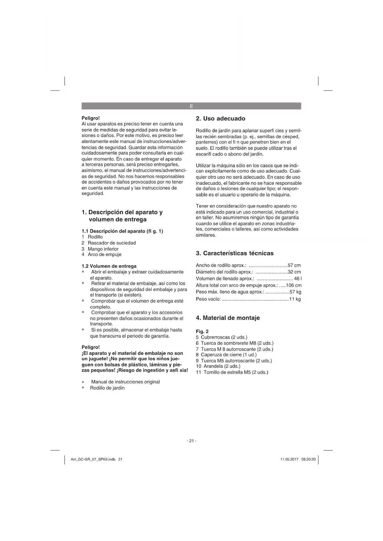 Rodillo de jardín para aplanar superfi cies y semil- las recién sembradas (p. ej., semillas de césped, panterres) con el fi n que penetren bien en el suelo. El rodillo también se puede utilizar tras el escarifi cado o abono del jardín. Utilizar la máquina sólo en los casos que se indi- can explícitamente como de uso adecuado. Cual- quier otro uso no será adecuado. En caso de uso inadecuado, el fabricante no se hace responsable de daños o lesiones de cualquier tipo; el respon- sable es el usuario u operario de la máquina. Tener en consideración que nuestro aparato no está indicado para un uso comercial, industrial o en taller. No asumiremos ningún tipo de garantía cuando se utilice el aparato en zonas industria- les, comerciales o talleres, así como actividades similares.