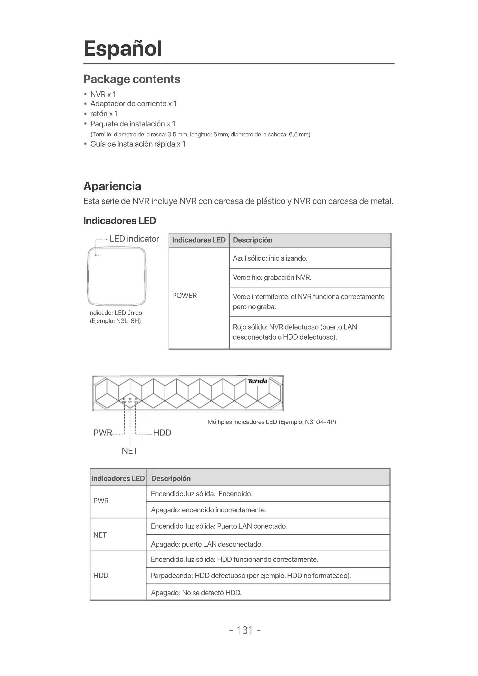 - Apague la cámara y reiníciela. P4. ¿Qué debo hacer si el NVR no puede encontrar la cámara? R4: Si el NVR es compatible con el puerto PoE y la cámara se ha conectado al puerto PoE del NVR, pruebe las siguientes soluciones: - Conecte el ordenador y la cámara a la misma red y habilite la función DHCP de la cámara (a través de la herramienta de administración de clientes, como el Administrador de dispositivos ONVIF o la interfaz de usuario web de la cámara para la configuración). - Si la cámara es una cámara de terceros, asegúrese de que la cámara sea compatible con el ONVIF, que el ONVIF esté habilitado y que se haya agregado un administrador con el nombre de usuario “admin” a la lista de usuarios. Si la cámara se ha conectado en el lado LAN del NVR, pruebe las siguientes soluciones: - Asegúrese de que la cámara funcione correctamente y de que esté conectada al conmutador o enrutador conectado al NVR. Compruebe también que el cable Ethernet está bien ajustado. - Asegúrese de que la dirección IP de la cámara esté en el mismo segmento de red que la dirección IP LAN del NVR (a través de la herramienta de administración de clientes, como el Administrador de dispositivos ONVIF o la interfaz de usuario web de la cámara para la configuración). - Si la cámara es una cámara de terceros, asegúrese de que la cámara sea compatible con el ONVIF, que el ONVIF esté habilitado y que se haya agregado un administrador con el nombre de usuario “admin” a la lista de usuarios. Si el problema persiste, póngase en contacto con el soporte técnico de Tenda.- 141 - Français Contenu de l'emballage Apparition NVR x 1Adaptateur d’alimentation x 1Souris x 1Paquet d'installation x 1 (Vis : diamètre du filetage : 3,5 mm, longueur : 5 mm ; diamètre de la tête : 6,5 mm)Guide d’installation rapide x 1 Voyant LED Ces séries de NVR comprennent un NVR à coque en plastique et un NVR à coque métallique.POWER Voyant LED Indicateur LED unique (Exemple : N3L-8H)Plusieurs indicateurs LED (Exemple: N3104-4P ) PWR NET HDD Voyant LED Description POWER Bleu fixe : Initialisation. Vert fixe : enregistrement NVR. Vert clignotant: le NVR fonctionne correctement mais n'enregistre pas. Rouge continu: NVR défectueux (port LAN déconnecté, ou disque dur défectueux). Voyant LED Description PWR NET HDD Allumé en continu: sous tension. Éteint: Alimenté de manière incorrecte. Allumé en continu: port LAN connecté. Éteint : port LAN déconnecté. Allumé en continu: le disque dur fonctionne correctement. Clignotant: disque dur défectueux (par exemple, disque dur non formaté.) Éteint: Aucun disque dur détecté.- 142 - Panneau du bas Trou de vis du disque dur Trous de montage mural Trous de montage mural Trou de vis du disque dur ConseilsTrous de montage mural : Utilisés pour fixer l'appareil au mur.Les matériaux de montage mural sont auto-préparés. Spécifications recommandées des vis et chevilles en plastique:Vis : diamètre du filetage: 3 mm, longueur: 14 mm ; diamètre de la tête: 5.2 mmCheville en plastique : diamètre intérieur : 6,0 mm ; longueur : 26,4 mm Coque plastique NVR (Exemple : N3L-8H) Coque métallique NVR (Exemple : N3104-4P) Panneau arrière Port d'alimentation Borne de mise à la terre Prise HDMI Port LAN 10/100 Mbit/s Port VGA PoE NVR (Exemple : N3104-4P) Connexions USB2.0