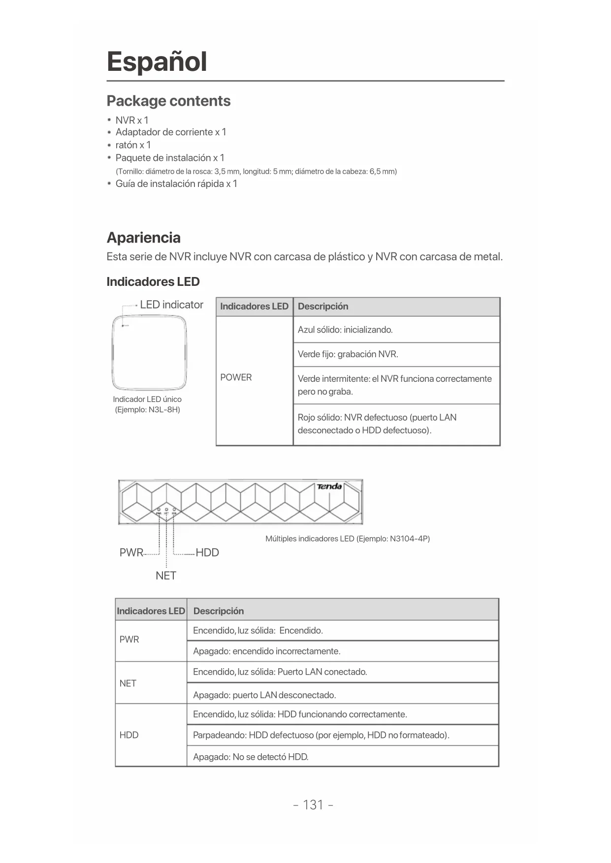 - Apague la cámara y reiníciela. P4. ¿Qué debo hacer si el NVR no puede encontrar la cámara? R4: Si el NVR es compatible con el puerto PoE y la cámara se ha conectado al puerto PoE del NVR, pruebe las siguientes soluciones: - Conecte el ordenador y la cámara a la misma red y habilite la función DHCP de la cámara (a través de la herramienta de administración de clientes, como el Administrador de dispositivos ONVIF o la interfaz de usuario web de la cámara para la configuración). - Si la cámara es una cámara de terceros, asegúrese de que la cámara sea compatible con el ONVIF, que el ONVIF esté habilitado y que se haya agregado un administrador con el nombre de usuario “admin” a la lista de usuarios. Si la cámara se ha conectado en el lado LAN del NVR, pruebe las siguientes soluciones: - Asegúrese de que la cámara funcione correctamente y de que esté conectada al conmutador o enrutador conectado al NVR. Compruebe también que el cable Ethernet está bien ajustado. - Asegúrese de que la dirección IP de la cámara esté en el mismo segmento de red que la dirección IP LAN del NVR (a través de la herramienta de administración de clientes, como el Administrador de dispositivos ONVIF o la interfaz de usuario web de la cámara para la configuración). - Si la cámara es una cámara de terceros, asegúrese de que la cámara sea compatible con el ONVIF, que el ONVIF esté habilitado y que se haya agregado un administrador con el nombre de usuario “admin” a la lista de usuarios. Si el problema persiste, póngase en contacto con el soporte técnico de Tenda.- 141 - Français Contenu de l'emballage Apparition NVR x 1Adaptateur d’alimentation x 1Souris x 1Paquet d'installation x 1 (Vis : diamètre du filetage : 3,5 mm, longueur : 5 mm ; diamètre de la tête : 6,5 mm)Guide d’installation rapide x 1 Voyant LED Ces séries de NVR comprennent un NVR à coque en plastique et un NVR à coque métallique.POWER Voyant LED Indicateur LED unique (Exemple : N3L-8H)Plusieurs indicateurs LED (Exemple: N3104-4P ) PWR NET HDD Voyant LED Description POWER Bleu fixe : Initialisation. Vert fixe : enregistrement NVR. Vert clignotant: le NVR fonctionne correctement mais n'enregistre pas. Rouge continu: NVR défectueux (port LAN déconnecté, ou disque dur défectueux). Voyant LED Description PWR NET HDD Allumé en continu: sous tension. Éteint: Alimenté de manière incorrecte. Allumé en continu: port LAN connecté. Éteint : port LAN déconnecté. Allumé en continu: le disque dur fonctionne correctement. Clignotant: disque dur défectueux (par exemple, disque dur non formaté.) Éteint: Aucun disque dur détecté.- 142 - Panneau du bas Trou de vis du disque dur Trous de montage mural Trous de montage mural Trou de vis du disque dur ConseilsTrous de montage mural : Utilisés pour fixer l'appareil au mur.Les matériaux de montage mural sont auto-préparés. Spécifications recommandées des vis et chevilles en plastique:Vis : diamètre du filetage: 3 mm, longueur: 14 mm ; diamètre de la tête: 5.2 mmCheville en plastique : diamètre intérieur : 6,0 mm ; longueur : 26,4 mm Coque plastique NVR (Exemple : N3L-8H) Coque métallique NVR (Exemple : N3104-4P) Panneau arrière Port d'alimentation Borne de mise à la terre Prise HDMI Port LAN 10/100 Mbit/s Port VGA PoE NVR (Exemple : N3104-4P) Connexions USB2.0