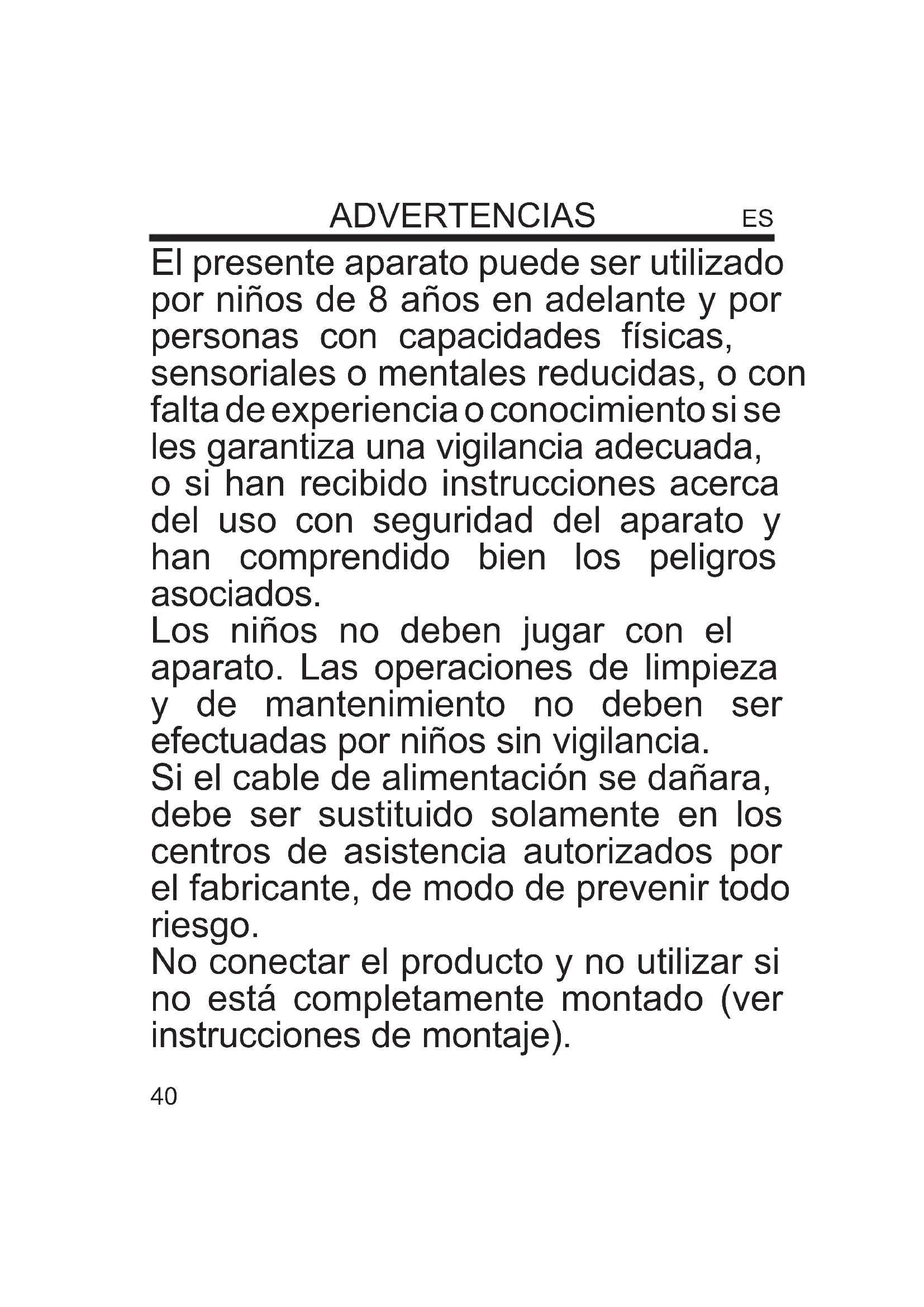 “Umsetzung der Richtlinie 2012/19/EU über Elektro- und Elektronik-Altgeräte (WEEE)” zur Verringerung der Verwendung gefährlicher Stoe in Elektro- und Elektronikgeräten sowie zur Abfallentsorgung. Das Symbol der durchgestrichenen Mülltonne auf dem Gerät oder seiner Verpackung weist darauf hin, dass das Produkt am Ende seiner Lebensdauer getrennt von anderen Abfällen entsorgt werden muss. Der Benutzer muss daher die ausgemusterten Geräte zu geeigneten getrennten Sammelstellen für Elektro- und Elektronikabfälle bringen. Für weitere Einzelheiten wenden Sie sich bitte an die zuständige lokale Behörde. Eine geeignete getrennte Sammlung der Geräte für das spätere Recycling, die Verarbeitung oder die umweltfreundliche Entsorgung trägt dazu bei, Schäden an der Umwelt und der menschlichen Gesundheit zu vermeiden, und fördert die Wiederverwendung und/ oder das Recycling der Materialien, aus denen die Geräte bestehen. Eine widerrechtliche Entsorgung des Produkts durch den Benutzer hat die Anwendung von Verwaltungsstrafen gemäß den geltenden Gesetzen zur Folge. BENUTZERINFORMATIONEN39 GARANTIESCHEIN Garantiebedingungen: Die Garantie dauert 24 Monate vom Einkaufsdatum. Dieser Garantieschein hat nur Gültigkeit, wenn er ordnungsgemäß ausgefüllt und zusammen mit dem Kassenzettel vorgelegt wird. Die Garantie umfaßt den Ersatz oder die Reparatur aller Komponenten des Gerätes im Falle von Herstellungsfehlern. Das Gerät wird ausschließlich nur von einem unserer autorisierten Kundendienststellen zurückgenommen. Außerdem garantieren wir für fachgerechte Dienstleistung (gegen Bezahlung) auch außerhalb der Garantiezeit. Die Herstellungsrma lehnt jede Verantwortung hinsichtlich Schäden an Personen, Tieren oder Gegenständen ab, die durch unsachgemäße Benutzung des Geräts oder Nichtbefolgen der beiliegenden Bedienungs- anleitung entstehen. Einschränkungen: Der Garantieanspruch bzw. unsere Verantwortlichkeit erlischt, wenn das Gerät: - von nicht autorisierten Personen demontiert wurde; - in unsachgemäßer oder unnormaler Weise zum Einsatz kam, aufbewahrt oder transportiert wurde. Weiterhin sind von der Garantie alle äußeren Abnutzungserscheinungen am Gerät, die die Funktion des Gerätes nicht beeinträchtigen, ausgeschlossen. Sollten, trotz der Sorgfalt bei der Auswahl der Materialien und trotz der Bemühungen bei der Realisierung des Produktes, das Sie erst gerade erworben haben, Defekte gefunden werden oder sollten Sie irgendwelche Informationen benötigen, so empfehlen wir Ihnen, sich an den für Ihr Gebiet zuständigen Fachhändler zu wenden.40 El presente aparato puede ser utilizado por niños de 8 años en adelante y por personas con capacidades físicas, sensoriales o mentales reducidas, o con falta de experiencia o conocimiento si se les garantiza una vigilancia adecuada, o si han recibido instrucciones acerca del uso con seguridad del aparato y han comprendido bien los peligros asociados. Los niños no deben jugar con el aparato. Las operaciones de limpieza y de mantenimiento no deben ser efectuadas por niños sin vigilancia. Si el cable de alimentación se dañara, debe ser sustituido solamente en los centros de asistencia autorizados por el fabricante, de modo de prevenir todo riesgo. No conectar el producto y no utilizar si no está completamente montado (ver instrucciones de montaje). ADVERTENCIAS ES41 Antes de quitar la pantalla protectora, asegùrese de que el ventilador esté desconnectado de la red de alimnetación. ATENCION : leer atentamente las advertencias contenidas en el presente folleto,ya que contienen importantes indicaciones acerca de laseguridad de instalación, uso y mantenimiento. Instrucciones importantes que hay que conservar para sucesivas consultas. Los niños NO deben jugar con el dispositivo. Este aparato deberá estar destinado solo al uso para el cual ha sido expresamente creado; cualquier empleo no conforme con las indicaciones contenidas en el presente manual es de considerar inadecuado y peligroso. El fabricante no puede ser considerado responsable por eventuales daños derivados por un uso inadecuado e/o irracional. Este aparato NO es adecuado para empleo en ambientes con atmósferas explosivas (con presencia de sustancias inamables bajo forma de gas, vapor, neblina o polvo, en condiciones atmosféricas donde, después del encendido, la combustión se propaga en el aire). Los elementos del embalaje (bolsas de plástico, poliestireno expandido, etc.) no deben ser dejados al alcance de niños o personas con capacidades reducidas ya que representan potenciales fuentes de peligro. La/el instalación/ensamblaje del dispositivo deberá ser efectuada/o según las prescripciones del fabricante. Un procedimiento errado puede causar daños a personas, animales o cosas, de los cuales el fabricante no puede ser considerado responsable. Colocar y utilizar el aparato en un nivel de apoyo horizontal y estable. Antes de utilizar el aparato vericar visualmente la integridad del mismo y de su cable de alimentación. En caso de dudas dirigirse a personal cualicado. Antes de alimentar el aparato asegurarse de que sus datos de placa (tensión y frecuencia) correspondan con los de la red de distribución eléctrica y que la toma sea adecuada al terminal del cable del cual que está dotado el aparato. Vericar que la instalación eléctrica utilizada para la alimentación esté dotada de las protecciones adecuadas de acuerdo con las leyes vigentes. NO alimentar el aparato mediante tomas múltiples. Evitar si es posible el empleo de adaptadores y/o alargadores; en caso de que su empleo fuera necesario utilizar exclusivamente material42 conforme con las normas vigentes de seguridad y en el respeto de los parámetros eléctricos de los adaptadores en cuestión. El aparato no debe ser encendido mediante temporizadores externos y/u otros dispositivos de control remoto no expresamente previstos por el presente manual. NO utilizar ni conservar el dispositiv