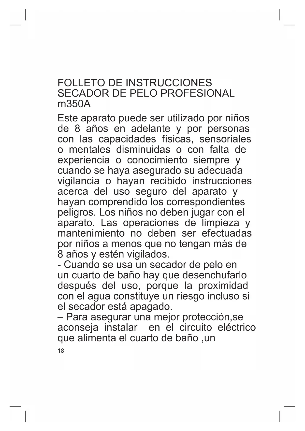 m350A19 No utilizar en la bañera ni en ducha. ATENCION: No utilizar este aparato cerca de bañeras, lavabos o otros recipientes que contengan agua. Si se rompe el cable de alimentación, debe ser substituido exclusivamente por a personal especializado. dispositifvo de corriente diferencial de functionamiento nominal que no sea superior a 30mA. Solicitar un consejo a su instalador respecto del mismo.20 Advertencias