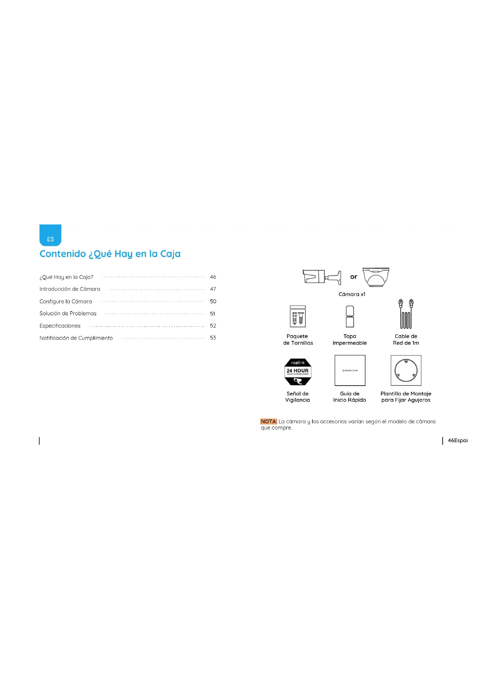 Cámara x1 Guía de Inicio Rápido Cable de Red de 1m Plantilla de Montaje para Fijar Agujeros Señal de Vigilancia Tapa Impermeable Paquete de Tornillos NOTA: La cámara y los accesorios varían según el modelo de cámara que compre.48Español 47 Español Introducción de Cámara Micrófono Incorporado Objetivo Luces Infrarrojas Sensor de Luz Solar Puerto de Alimentación (Opcional) Cable de Red Tapa Impermeable Caja Metálica Base de Montaje Orificio de Reinicio *Presione durante unos 10 segundos para restaurar el dispositivo a laconfiguración de fábrica. Micrófono Incorporado Objetivo Luces Infrarrojas Sensor de Luz Solar Base de Montaje Objetivo Caja Metálica Base de Montaje Luces Infrarrojas Micrófono Incorporado Sensor de Luz Solar50Español 49 Español Paso 1. Conecte la cámara a un puerto POE en Reolink POE NVR con un cable de Ethernet. Paso 2. Configure la cámara a través de la plataforma de NVR. Haga clic en en la pantalla de vista en directo y vaya al menú de configura- ción para configurar la cámara. NOTA: La cámara adicional SOLO puede funcionar con Reolink POE NVR. No es una cámara independiente y no puede funcionar con otro software de terceros. Configure la Cámara