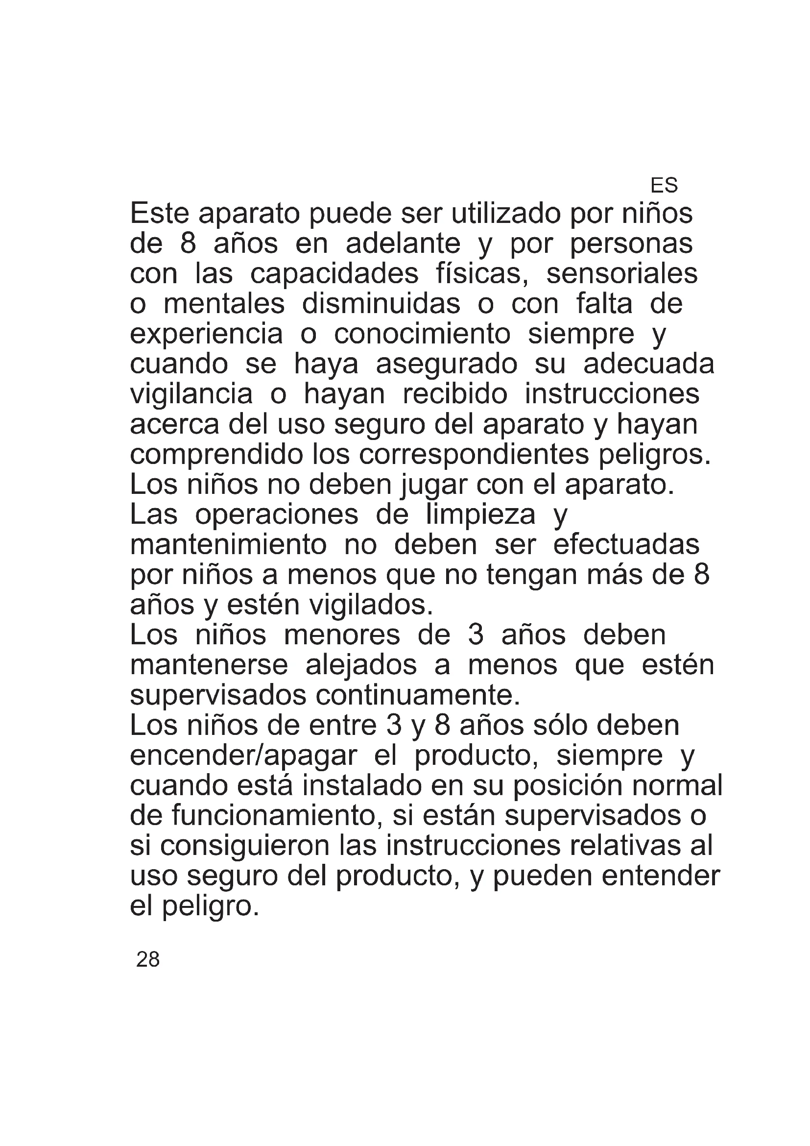 DE26 Wartung Vor dem Reinigen des Gerätes hat man immer das Netzkabel aus der Steckdose herauszuziehen und Gerät völlig abkühlen lassen. Dieses Gerät bedarf keinerlei besonderen Wartung. Zum Reinigen des Gerätes einen weichen und leicht feuchten Lappen benutzen. Keine Schmirgelprodukte oder chemische Lösemittel benutzen. Verwenden Sie keine nassen Stoe, Flüssigkeiten oder sehr nasse Tücher, da eventuell eindringendes Wasser das Gerät irreparabel beschädigen kann. NIEMALS DAS GERÄT IN WASSER TAUCHEN. Auswechseln der Leuchten Lösen Sie die beiden Schrauben, mit denen die unten bendliche Platte auf der Rückseite des Gerätes befestigt ist. Ersetzen Sie die nicht funktionierende Leuchte durch eine mit den gleichen technischen Daten, die auf dieser angegeben sind. Verschließen Sie die Platte wieder richtig.2728 Este aparato puede ser utilizado por niños de 8 años en adelante y por personas con las capacidades físicas, sensoriales o mentales disminuidas o con falta de experiencia o conocimiento siempre y cuando se haya asegurado su adecuada vigilancia o hayan recibido instrucciones acerca del uso seguro del aparato y hayan comprendido los correspondientes peligros. Los niños no deben jugar con el aparato. Las operaciones de limpieza y mantenimiento no deben ser efectuadas por niños a menos que no tengan más de 8 años y estén vigilados. Los niños menores de 3 años deben mantenerse alejados a menos que estén supervisados continuamente. Los niños de entre 3 y 8 años sólo deben encender/apagar el producto, siempre y cuando está instalado en su posición normal de funcionamiento, si están supervisados o si consiguieron las instrucciones relativas al uso seguro del producto, y pueden entender el peligro. ES29 Los niños de entre 3 y 8 años no deben conectarlo, ajustar o limpiar el aparato o realizar el mantenimiento estándar. ATENCIÓN : Algunas partes de este producto pueden calentarse y provocar quemaduras. Es importante prestar especial atención si hay niños o personas vulnerables. Si se rompe el cable de alimentación, debe ser substituido exclusivamente por los centros de asistencia autorizados por el fabricante. ATENCIÓN: Para evitar cualquier peligro debido al rearme accidental del dispositivo térmico de interrupción, este aparato no se debe alimentar con un dispositivo de maniobra externa, como un temporizador ni se debe conectar a un circuito que normalmente recibe alimentación del servicio. ATENCIÓN:. No lo use en habitaciones pequeñas cuando estas estén ocupadas por personas que no puedan dejar la habitación solas a menos que no estén constantemente vigiladas.30 Advertencias ATENCIÓN: para evitar sobrecalentamientos, no cubrir el aparato. No situar el aparato inmediatamente por debajo de una toma de corriente. No utilizar el aparato cerca de lavabos, bañeras, duchas o piscinas. ATENCIÓN : leer atentamente las advertencias contenidas en el presente folleto,ya que contienen importantes indicaciones acerca de la seguridad de instalación, uso y mantenimiento. Instrucciones importantes que hay que conservar para sucesivas consultas. Conservar la garantía, el recibo y el presente folleto de instrucciones para sucesivas consultas. Después de haber sacado el embalaje asegurarse de la integridad del aparato y en caso de visibles daños no utilizarlo y contactar con el establecimiento distribuidor. No dejar partes del embalaje al alcance de los niños. El aparato no se debe utilizar como un juguete; es un aparato eléctrico y así debe ser considerado. Antes de conectar el aparato asegurarse de que la tensión presente en la toma de corriente corresponda a la indicada en las características nominales. En el caso de que la toma y el enchufe no sean compatibles, hacer reemplazar la toma por personal calicado con una del tipo adecuado. No utilizar adaptadores o extensiones que no correspondan a las vigentes normativas de seguridad o que superen los límites de carga de la corriente. NO CUBRIR ES31 Desconectar el aparato de la red de alimentación cuando no se utiliza. No tirar el cable de alimentación o el mismo aparato para desconectar el enchufe de la toma de corriente. El uso de cualquier aparato eléctrico requiere el respeto de algunas reglas fundamentales, en particular: - No tocar el aparato con las manos mojadas o húmedas. - No dejar el aparato expuesto a la acción de agentes atmosféricos (llvia, sol). - No someterlo a choques. En caso de que se produjera un desperfecto o un funcionamiento anómalo del aparato desconectar inmediatamente el enchufe, no abrir el aparato y contactar con el establecimiento distribuidor. En caso de que no se desee utilizar más este tipo de aparato, es necesario inactivarlo cortando el cable de alimentación naturalmente después de haber desconectado la toma de corriente. Se aconseja desenrollar completamente el cable de alimentación en toda su longitud evitando de este modo eventuales recalentamientos. Por motivos de seguridad, no es posible abrir el aparato. El aparato ha sido fabricado y concebido para funcionar en ambientes domésticos; cualquier otro uso hay que considerarlo impropio y por lo tanto peligroso. No introducir objeto alguno a través de la rejilla de protección y de las tomas de aire. No utilizar el aparato en presencia de material inamable (gasolina,pintura, etc.). Mantener el cable lejos de fuentes de calor. ATENCIÓN: NO UTILIZAR EL PRODUCTO CERCA DE CORTINAS U OTROS MATERIALES COMBUSTIBLES. ATENCIÓN: PARA EVITAR SOBRECALENTAMIENTOS, NO CUBRIR EL APARATO Y NO OBSTRUIR LAS TOMAS DE AIRE. Características técnicas