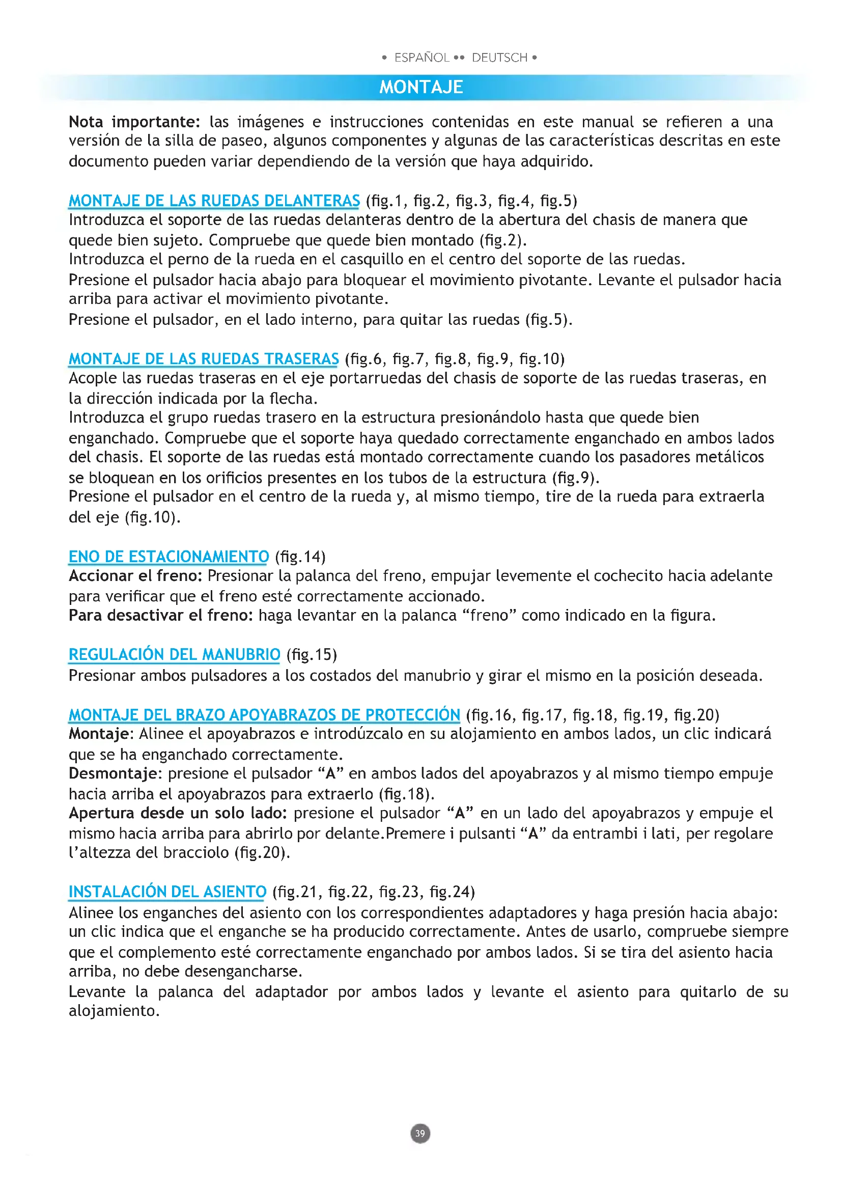 - ESPAÑOL •• DEUTSCH • Nota importante: las imágenes e instrucciones contenidas en este manual se reeren a una versión de la silla de paseo, algunos componentes y algunas de las características descritas en este documento pueden variar dependiendo de la versión que haya adquirido. MONTAJE DE LAS RUEDAS DELANTERAS (g.1, g.2, g.3, g.4, g.5) Introduzca el soporte de las ruedas delanteras dentro de la abertura del chasis de manera que quede bien sujeto. Compruebe que quede bien montado (g.2). Introduzca el perno de la rueda en el casquillo en el centro del soporte de las ruedas. Presione el pulsador hacia abajo para bloquear el movimiento pivotante. Levante el pulsador hacia arriba para activar el movimiento pivotante. Presione el pulsador, en el lado interno, para quitar las ruedas (g.5). MONTAJE DE LAS RUEDAS TRASERAS (g.6, g.7, g.8, g.9, g.10) Acople las ruedas traseras en el eje portarruedas del chasis de soporte de las ruedas traseras, en la dirección indicada por la echa. Introduzca el grupo ruedas trasero en la estructura presionándolo hasta que quede bien enganchado. Compruebe que el soporte haya quedado correctamente enganchado en ambos lados del chasis. El soporte de las ruedas está montado correctamente cuando los pasadores metálicos se bloquean en los oricios presentes en los tubos de la estructura (g.9). Presione el pulsador en el centro de la rueda y, al mismo tiempo, tire de la rueda para extraerla del eje (g.10). ENO DE ESTACIONAMIENTO (g.14) Accionar el freno: Presionar la palanca del freno, empujar levemente el cochecito hacia adelante para vericar que el freno esté correctamente accionado. Para desactivar el freno: haga levantar en la palanca “freno” como indicado en la gura. REGULACIÓN DEL MANUBRIO (g.15) Presionar ambos pulsadores a los costados del manubrio y girar el mismo en la posición deseada. MONTAJE DEL BRAZO APOYABRAZOS DE PROTECCIÓN (g.16, g.17, g.18, g.19, g.20) Montaje: Alinee el apoyabrazos e introdúzcalo en su alojamiento en ambos lados, un clic indicará que se ha enganchado correctamente. Desmontaje: presione el pulsador “A” en ambos lados del apoyabrazos y al mismo tiempo empuje hacia arriba el apoyabrazos para extraerlo (g.18). Apertura desde un solo lado: presione el pulsador “A” en un lado del apoyabrazos y empuje el mismo hacia arriba para abrirlo por delante.Premere i pulsanti “A” da entrambi i lati, per regolare l’altezza del bracciolo (g.20). INSTALACIÓN DEL ASIENTO (g.21, g.22, g.23, g.24) Alinee los enganches del asiento con los correspondientes adaptadores y haga presión hacia abajo: un clic indica que el enganche se ha producido correctamente. Antes de usarlo, compruebe siempre que el complemento esté correctamente enganchado por ambos lados. Si se tira del asiento hacia arriba, no debe desengancharse. Levante la palanca del adaptador por ambos lados y levante el asiento para quitarlo de su alojamiento. MONTAJE40