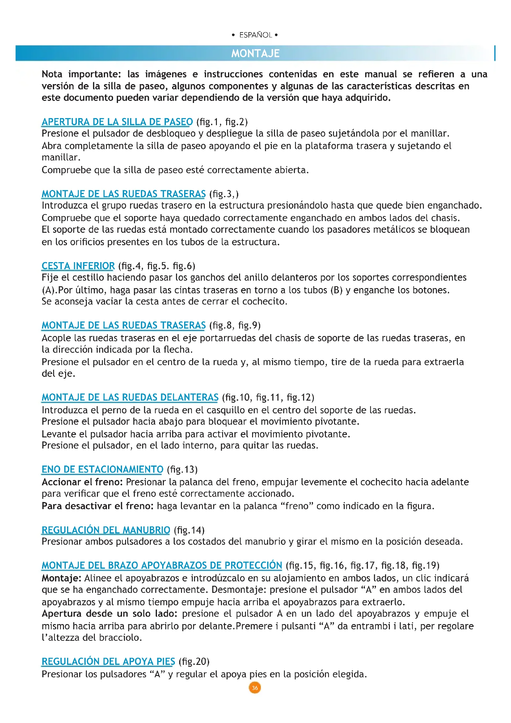 - ESPAÑOL • • ESPAÑOL • Nota importante: las imágenes e instrucciones contenidas en este manual se reeren a una versión de la silla de paseo, algunos componentes y algunas de las características descritas en este documento pueden variar dependiendo de la versión que haya adquirido. APERTURA DE LA SILLA DE PASEO (g.1, g.2) Presione el pulsador de desbloqueo y despliegue la silla de paseo sujetándola por el manillar. Abra completamente la silla de paseo apoyando el pie en la plataforma trasera y sujetando el manillar. Compruebe que la silla de paseo esté correctamente abierta. MONTAJE DE LAS RUEDAS TRASERAS (g.3,) Introduzca el grupo ruedas trasero en la estructura presionándolo hasta que quede bien enganchado. Compruebe que el soporte haya quedado correctamente enganchado en ambos lados del chasis. El soporte de las ruedas está montado correctamente cuando los pasadores metálicos se bloquean en los oricios presentes en los tubos de la estructura. CESTA INFERIOR (g.4, g.5. g.6) Fije el cestillo haciendo pasar los ganchos del anillo delanteros por los soportes correspondientes (A).Por último, haga pasar las cintas traseras en torno a los tubos (B) y enganche los botones. Se aconseja vaciar la cesta antes de cerrar el cochecito. MONTAJE DE LAS RUEDAS TRASERAS (g.8, g.9) Acople las ruedas traseras en el eje portarruedas del chasis de soporte de las ruedas traseras, en la dirección indicada por la echa. Presione el pulsador en el centro de la rueda y, al mismo tiempo, tire de la rueda para extraerla del eje. MONTAJE DE LAS RUEDAS DELANTERAS (g.10, g.11, g.12) Introduzca el perno de la rueda en el casquillo en el centro del soporte de las ruedas. Presione el pulsador hacia abajo para bloquear el movimiento pivotante. Levante el pulsador hacia arriba para activar el movimiento pivotante. Presione el pulsador, en el lado interno, para quitar las ruedas. ENO DE ESTACIONAMIENTO (g.13) Accionar el freno: Presionar la palanca del freno, empujar levemente el cochecito hacia adelante para vericar que el freno esté correctamente accionado. Para desactivar el freno: haga levantar en la palanca “freno” como indicado en la gura. REGULACIÓN DEL MANUBRIO (g.14) Presionar ambos pulsadores a los costados del manubrio y girar el mismo en la posición deseada. MONTAJE DEL BRAZO APOYABRAZOS DE PROTECCIÓN (g.15, g.16, g.17, g.18, g.19) Montaje: Alinee el apoyabrazos e introdúzcalo en su alojamiento en ambos lados, un clic indicará que se ha enganchado correctamente. Desmontaje: presione el pulsador “A” en ambos lados del apoyabrazos y al mismo tiempo empuje hacia arriba el apoyabrazos para extraerlo. Apertura desde un solo lado: presione el pulsador A en un lado del apoyabrazos y empuje el mismo hacia arriba para abrirlo por delante.Premere i pulsanti “A” da entrambi i lati, per regolare l’altezza del bracciolo. REGULACIÓN DEL APOYA PIES (g.20) Presionar los pulsadores “A” y regular el apoya pies en la posición elegida. MONTAJE37