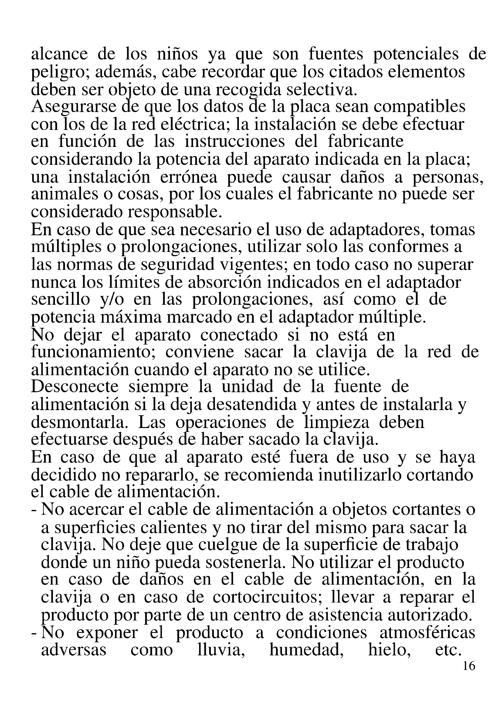 A continuación se presentan importantes indicaciones sobre la instalación, el uso y el mantenimiento. Conservar con cuidado este manual para cualquier consulta posterior; utilizar el producto solo de la manera que indica este manual de instrucciones; cualquier otro uso se considera inadecuado y peligroso; por ello el fabricante no puede ser considerado responsable en caso de que se produzcan daños derivados de usos inadecuados, erróneos o irracionales. Antes del uso asegurarse de la integridad del aparato; en caso de duda no utilizarlo y dirigirse al personal de asistencia; no dejar los elementos del embalaje (bolsas de plástico, poliestireno expandido, clavos, grapas, etc.) al16 alcance de los niños ya que son fuentes potenciales de peligro; además, cabe recordar que los citados elementos deben ser objeto de una recogida selectiva. Asegurarse de que los datos de la placa sean compatibles con los de la red eléctrica; la instalación se debe efectuar en función de las instrucciones del fabricante considerando la potencia del aparato indicada en la placa; una instalación errónea puede causar daños a personas, animales o cosas, por los cuales el fabricante no puede ser considerado responsable. En caso de que sea necesario el uso de adaptadores, tomas múltiples o prolongaciones, utilizar solo las conformes a las normas de seguridad vigentes; en todo caso no superar nunca los límites de absorción indicados en el adaptador sencillo y/o en las prolongaciones, así como el de potencia máxima marcado en el adaptador múltiple. No dejar el aparato conectado si no está en funcionamiento; conviene sacar la clavija de la red de alimentación cuando el aparato no se utilice. Desconecte siempre la unidad de la fuente de alimentación si la deja desatendida y antes de instalarla y desmontarla. Las operaciones de limpieza deben efectuarse después de haber sacado la clavija. En caso de que al aparato esté fuera de uso y se haya decidido no repararlo, se recomienda inutilizarlo cortando el cable de alimentación. - No acercar el cable de alimentación a objetos cortantes o a superficies calientes y no tirar del mismo para sacar la clavija. No deje que cuelgue de la superficie de trabajo donde un niño pueda sostenerla. No utilizar el producto en caso de daños en el cable de alimentación, en la clavija o en caso de cortocircuitos; llevar a reparar el producto por parte de un centro de asistencia autorizado. - No exponer el producto a condiciones atmosféricas adversas como lluvia, humedad, hielo, etc.17 Conservarlo en lugares secos. No manejar o tocar el producto con las manos húmedas o los pies descalzos. - Este aparato no debe ser usado por niños, incluso si son mayores de 8 años. - Este aparato puede ser utilizado por personas con capacidades físicas, sensoriales o mentales reducidas o con falta de experiencia o conocimiento si a dichas personas se ha asegurado una supervisión o bien si han recibido instrucciones sobre el uso seguro del aparato. - Los niños no deben jugar con el aparato. - Mantener el producto y el cable fuera del alcance de los niños menores de 8 años. - No apto para uso comercial. Solo para uso doméstico En caso de avería y/o de funcionamiento anómalo no manipular el aparato. Para una posible reparación, dirigirse únicamente a un centro autorizado por el fabricante y solicitar el uso de recambios originales. El incumplimiento de lo indicado anteriormente puede comprometer la seguridad del aparato y anular las condiciones de la garantía. ATENCIÓN: el producto tiene una función de calentamiento. Las superficies pueden desarrollar altas temperaturas. La percepción de la temperatura es distinta para cada persona, utilizar el aparato con cautela. Tocar solo las superficies diseñadas para ser tocadas, y usar agarradores o guantes de cocina. Este aparato está diseñado para uso doméstico o similares: cocinas para el personal de tiendas, oficinas u otros centros de trabajo, para clientes de hoteles, moteles, hostales y similares. El aparato no está diseñado para su uso a través de temporizadores externos o mandos a distancia. Antes de cada uso, desenrolle el cable de alimentación. Utilice únicamente piezas de repuesto y accesorios18 originales. No someta el producto a impactos fuertes se producirán daños serios.