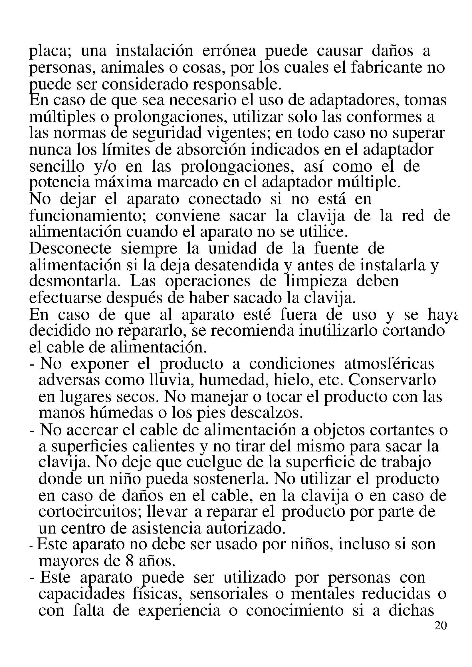 A continuación se presentan importantes indicaciones sobre la instalación, el uso y el mantenimiento. Conservar con cuidado este manual para cualquier consulta posterior; utilizar el producto solo de la manera que indica este manual de instrucciones; cualquier otro uso se considera inadecuado y peligroso; por ello el fabricante no puede ser considerado responsable en caso de que se produzcan daños derivados de usos inadecuados, erróneos o irracionales. Antes del uso asegurarse de la integridad del aparato; en caso de duda no utilizarlo y dirigirse al personal de asistencia; no dejar los elementos del embalaje (bolsas de plástico, poliestireno expandido, clavos, grapas, etc.) al alcance de los niños ya que son fuentes potenciales de peligro; además, cabe recordar que los citados elementos deben ser objeto de una recogida selectiva. Asegurarse de que los datos de la placa sean compatibles con los de la red eléctrica; la instalación se debe efectuar en función de las instrucciones del fabricante considerando la potencia del aparato indicada en la20 placa; una instalación errónea puede causar daños a personas, animales o cosas, por los cuales el fabricante no puede ser considerado responsable. En caso de que sea necesario el uso de adaptadores, tomas múltiples o prolongaciones, utilizar solo las conformes a las normas de seguridad vigentes; en todo caso no superar nunca los límites de absorción indicados en el adaptador sencillo y/o en las prolongaciones, así como el de potencia máxima marcado en el adaptador múltiple. No dejar el aparato conectado si no está en funcionamiento; conviene sacar la clavija de la red de alimentación cuando el aparato no se utilice. Desconecte siempre la unidad de la fuente de alimentación si la deja desatendida y antes de instalarla y desmontarla. Las operaciones de limpieza deben efectuarse después de haber sacado la clavija. En caso de que al aparato esté fuera de uso y se haya decidido no repararlo, se recomienda inutilizarlo cortando el cable de alimentación. - No exponer el producto a condiciones atmosféricas adversas como lluvia, humedad, hielo, etc. Conservarlo en lugares secos. No manejar o tocar el producto con las manos húmedas o los pies descalzos. - No acercar el cable de alimentación a objetos cortantes o a superficies calientes y no tirar del mismo para sacar la clavija. No deje que cuelgue de la superficie de trabajo donde un niño pueda sostenerla. No utilizar el producto en caso de daños en el cable, en la clavija o en caso de cortocircuitos; llevar a reparar el producto por parte de un centro de asistencia autorizado. - Este aparato no debe ser usado por niños, incluso si son mayores de 8 años. - Este aparato puede ser utilizado por personas con capacidades físicas, sensoriales o mentales reducidas o con falta de experiencia o conocimiento si a dichas21 personas se ha asegurado una supervisión o bien si han recibido instrucciones sobre el uso seguro del aparato. - Los niños no deben jugar con el aparato. - Mantener el producto y el cable fuera del alcance de los niños menores de 8 años. - No apto para uso comercial. Solo para uso doméstico En caso de avería y/o de funcionamiento anómalo no manipular el aparato. Para una posible reparación, dirigirse únicamente a un centro autorizado por el fabricante y solicitar el uso de recambios originales. El incumplimiento de lo indicado anteriormente puede comprometer la seguridad del aparato y anular las condiciones de la garantía. Antes de cada uso, desenrolle el cable de alimentación. Este aparato está diseñado para uso doméstico o similares: cocinas para el personal de tiendas, oficinas u otros centros de trabajo, para clientes de hoteles, moteles, hostales y similares. El aparato no está diseñado para su uso a través de temporizadores externos o mandos a distancia. Utilice únicamente piezas de repuesto y accesorios originales. No someta el producto a impactos fuertes se producirán daños serios. Mantenga la unidad lejos de materiales inflamables, calor, puntos fríos y vapor.