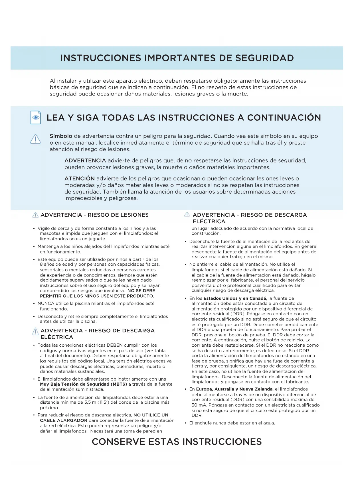 - Para reducir el riesgo de descarga eléctrica, NO UTILICE UN CABLE ALARGADOR para conectar la fuente de alimentación a la red eléctrica. Esto podría representar un peligro y/o dañar el limpiafondos. Necesitará una toma de pared en Símbolo de advertencia contra un peligro para la seguridad. Cuando vea este símbolo en su equipo o en este manual, localice inmediatamente el término de seguridad que se halla tras él y preste atención al riesgo de lesiones. ADVERTENCIA advierte de peligros que, de no respetarse las instrucciones de seguridad, pueden provocar lesiones graves, la muerte o daños materiales importantes. ATENCIÓN advierte de los peligros que ocasionan o pueden ocasionar lesiones leves o moderadas y/o daños materiales leves o moderados si no se respetan las instrucciones de seguridad. También llama la atención de los usuarios sobre determinadas acciones impredecibles y peligrosas. LEA Y SIGA TODAS LAS INSTRUCCIONES A CONTINUACIÓN