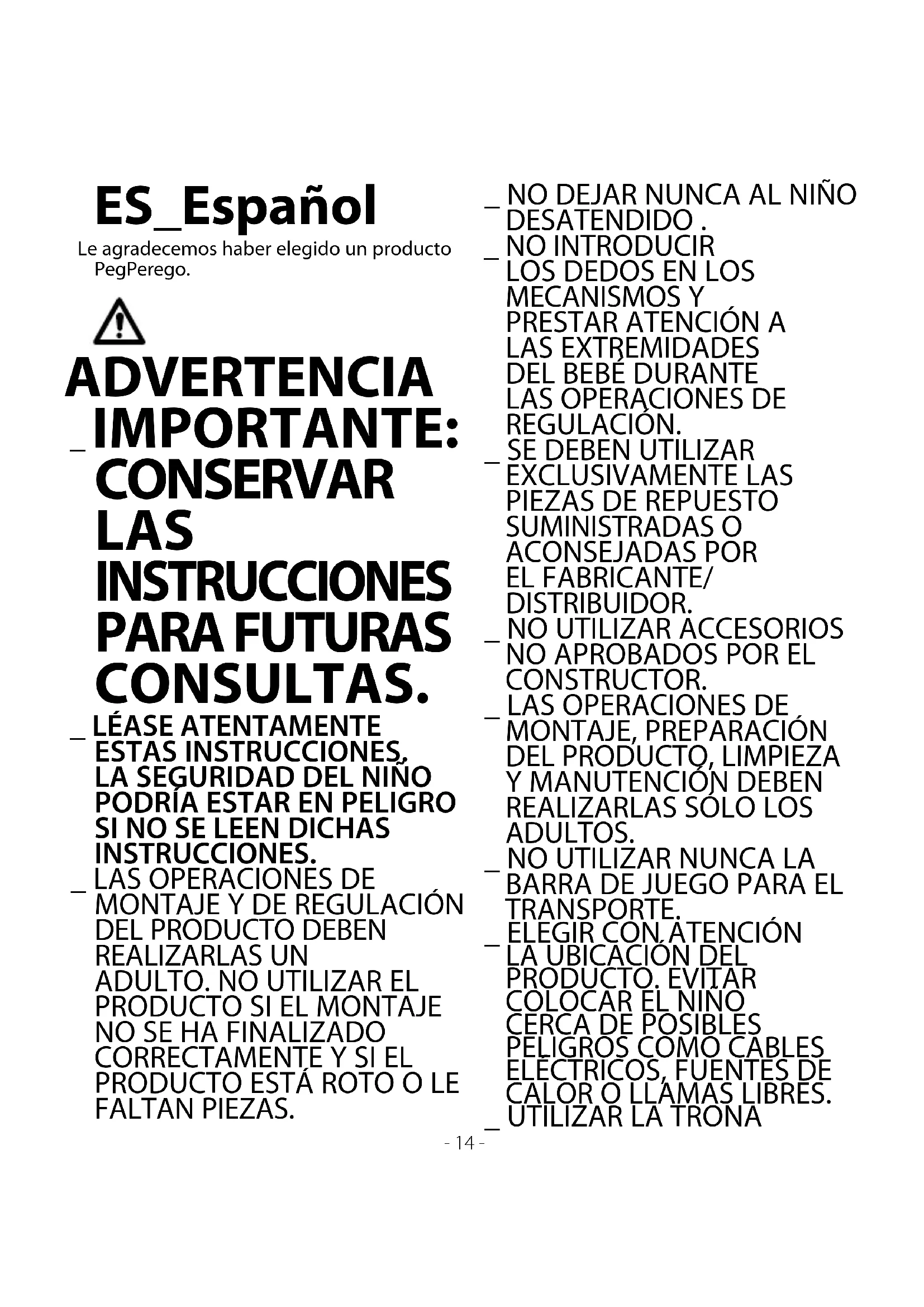 PegPerego SpA es una empresa con sistema de gestión de la calidad certificadopor TÜV Italia Srl, de acuerdo con la norma ISO 9001. La certificación ofrece a los clientes y a los consumidores la garantía de transparencia y de confianza en cuanto a los procedimientos de trabajo de la empresa. SERVICIO DE ASISTENCIA PEGPEREGO Si se pierden o dañan algunas partes del modelo, utilizar únicamente repuestos originales PegPerego. Para cualquier reparación, sustitución, información acerca de los productos, venta de repuestos originales y accesorios, contactar con el Servicio de Asistencia PegPerego indicando, en caso fuere presente, el número de serie del producto. tel. 0039/039/60.88.213 e-mail customer.service@pegperego.com sito internet www.pegperego.com Todos los derechos de propiedad intelectual sobre los contenidos de este manual de instrucciones pertenecen a PegPerego S.p.A. y están protegidos por las leyes vigentes. USA tel. 800.671.1701 fax 260.471.6332 call us toll free 1.800.671.1701 website: www.pegperego.com - 16 -RU_Pусский Благодарим вас за то, что вы выбрали продукцию компании PegPеrego. РЕДУПРЕЖДЕНИЕ