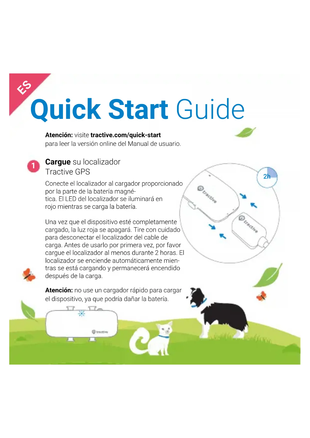 Atención: visite tractive.com/quick-start para leer la versión online del Manual de usuario. Cargue su localizador Tractive GPS Conecte el localizador al cargador proporcionado por la parte de la batería magné- tica. El LED del localizador se iluminará en rojo mientras se carga la batería. Una vez que el dispositivo esté completamente cargado, la luz roja se apagará. Tire con cuidado para desconectar el localizador del cable de carga. Antes de usarlo por primera vez, por favor cargue el localizador al menos durante 2 horas. El localizador se enciende automáticamente mien- tras se está cargando y permanecerá encendido después de la carga. Atención: no use un cargador rápido para cargar el dispositivo, ya que podría dañar la batería.2