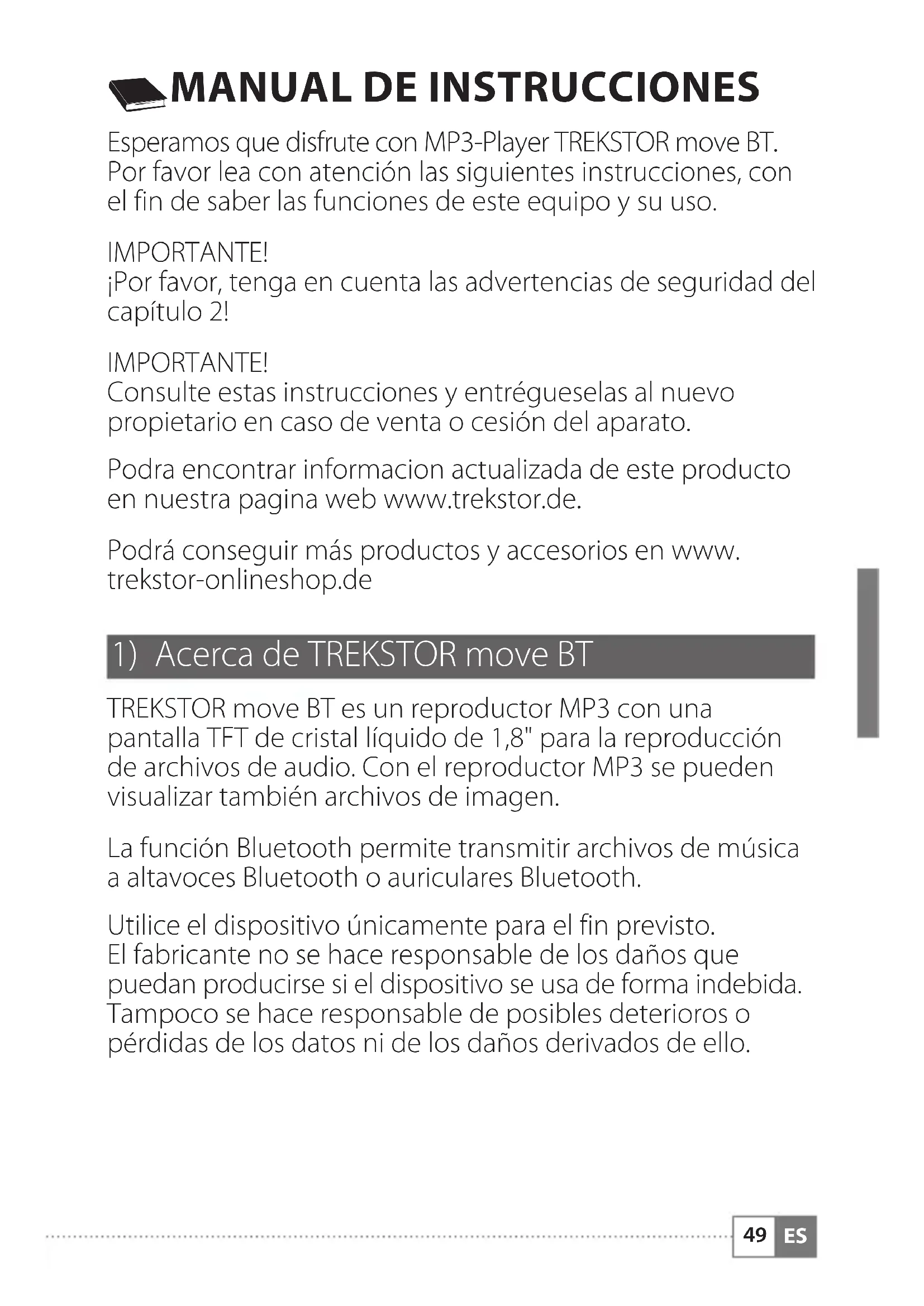 Esperamos que disfrute con MP3-Player TREKSTOR move BT. Por favor lea con atención las siguientes instrucciones, con el fin de saber las funciones de este equipo y su uso. IMPORTANTE! ¡Por favor, tenga en cuenta las advertencias de seguridad del capítulo 2! IMPORTANTE! Consulte estas instrucciones y entrégueselas al nuevo propietario en caso de venta o cesión del aparato. Podra encontrar informacion actualizada de este producto en nuestra pagina web www.trekstor.de. Podrá conseguir más productos y accesorios en www. trekstor-onlineshop.de