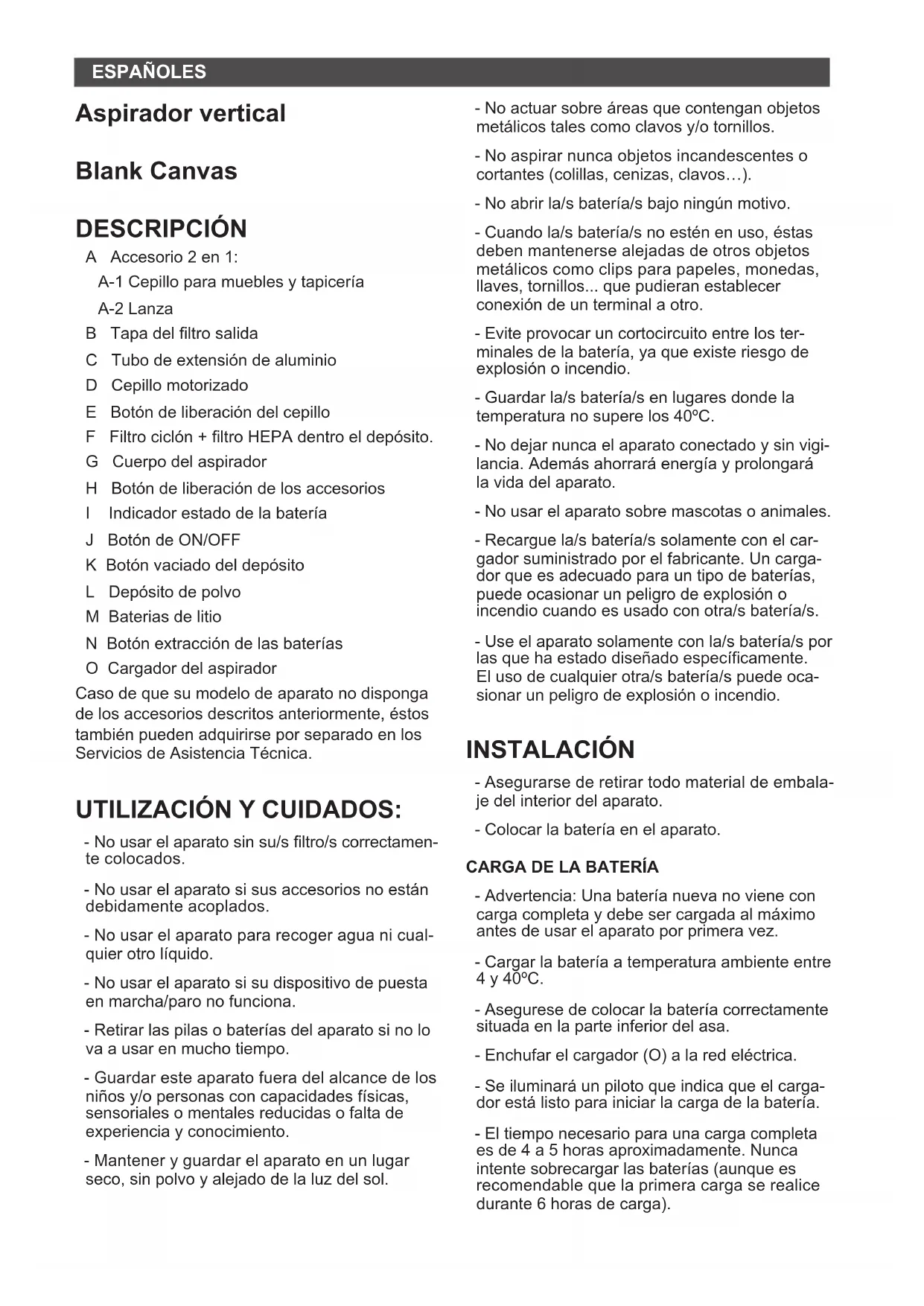 DFig.1 Fig.2 Fig.3Fig.4 Fig.5/6 Fig.7 Fig.8ESPAÑOL ES Aspirador vertical Blank Canvas DESCRIPCIÓN A Accesorio 2 en 1: A-1 Cepillo para muebles y tapicería A-2 Lanza B Tapa del ltro salida C Tubo de extensión de aluminio D Cepillo motorizado E Botón de liberación del cepillo F Filtro ciclón + ltro HEPA dentro el depósito. G Cuerpo del aspirador H Botón de liberación de los accesorios I Indicador estado de la batería J Botón de ON/OFF K Botón vaciado del depósito L Depósito de polvo M Baterias de litio N Botón extracción de las baterías O Cargador del aspirador Caso de que su modelo de aparato no disponga de los accesorios descritos anteriormente, éstos también pueden adquirirse por separado en los Servicios de Asistencia Técnica. UTILIZACIÓN Y CUIDADOS: - No usar el aparato sin su/s ltro/s correctamen- te colocados. - No usar el aparato si sus accesorios no están debidamente acoplados. - No usar el aparato para recoger agua ni cual- quier otro líquido. - No usar el aparato si su dispositivo de puesta en marcha/paro no funciona. - Retirar las pilas o baterías del aparato si no lo va a usar en mucho tiempo. - Guardar este aparato fuera del alcance de los niños y/o personas con capacidades físicas, sensoriales o mentales reducidas o falta de experiencia y conocimiento. - Mantener y guardar el aparato en un lugar seco, sin polvo y alejado de la luz del sol. - No actuar sobre áreas que contengan objetos metálicos tales como clavos y/o tornillos. - No aspirar nunca objetos incandescentes o cortantes (colillas, cenizas, clavos…). - No abrir la/s batería/s bajo ningún motivo. - Cuando la/s batería/s no estén en uso, éstas deben mantenerse alejadas de otros objetos metálicos como clips para papeles, monedas, llaves, tornillos... que pudieran establecer conexión de un terminal a otro. - Evite provocar un cortocircuito entre los ter- minales de la batería, ya que existe riesgo de explosión o incendio. - Guardar la/s batería/s en lugares donde la temperatura no supere los 40ºC. - No dejar nunca el aparato conectado y sin vigi- lancia. Además ahorrará energía y prolongará la vida del aparato. - No usar el aparato sobre mascotas o animales. - Recargue la/s batería/s solamente con el car- gador suministrado por el fabricante. Un carga- dor que es adecuado para un tipo de baterías, puede ocasionar un peligro de explosión o incendio cuando es usado con otra/s batería/s. - Use el aparato solamente con la/s batería/s por las que ha estado diseñado especícamente. El uso de cualquier otra/s batería/s puede oca- sionar un peligro de explosión o incendio. INSTALACIÓN - Asegurarse de retirar todo material de embala- je del interior del aparato. - Colocar la batería en el aparato.