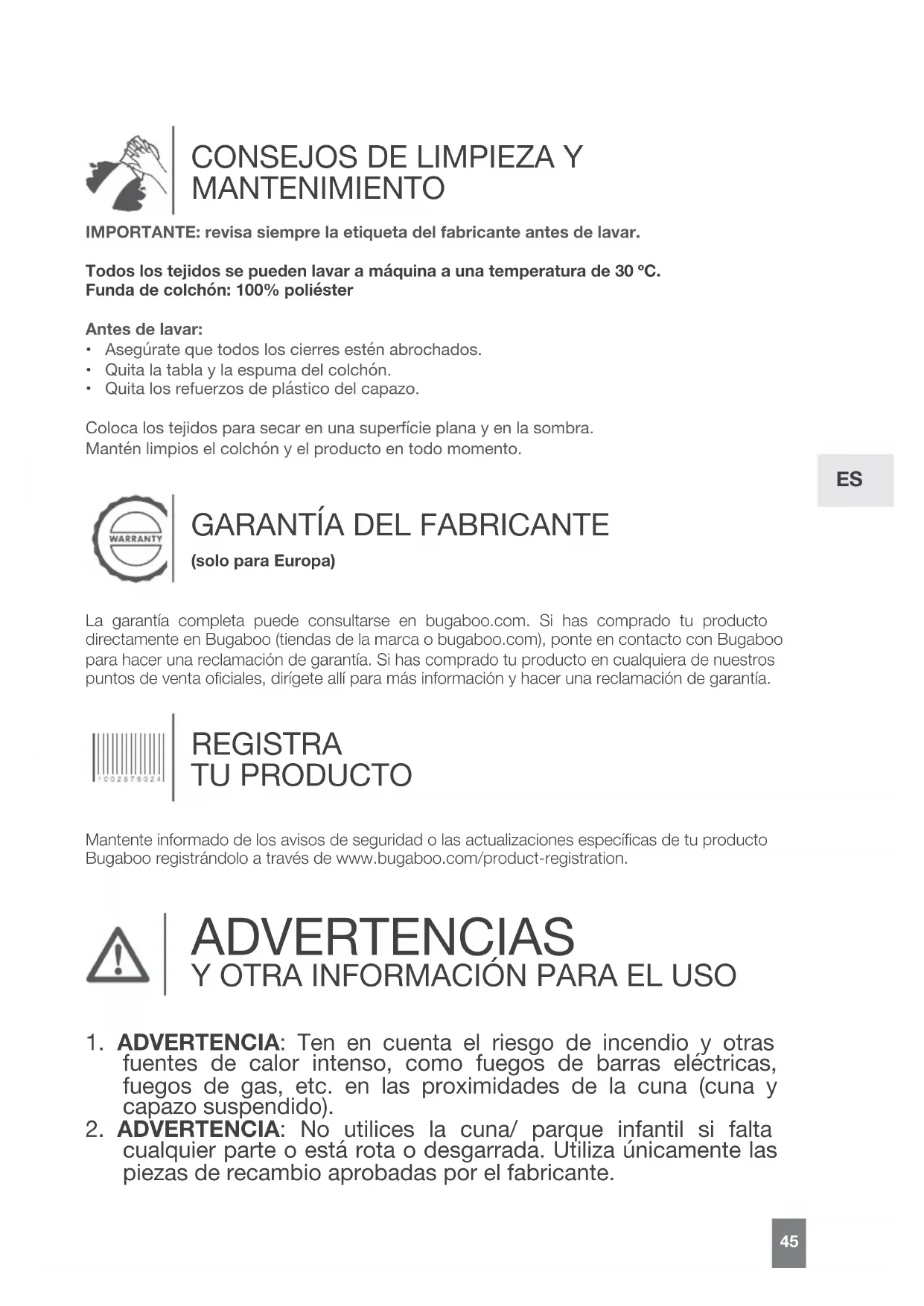 (solo para Europa)La garantía completa puede consultarse en bugaboo.com. Si has comprado tu producto directamente en Bugaboo (tiendas de la marca o bugaboo.com), ponte en contacto con Bugaboo para hacer una reclamación de garantía. Si has comprado tu producto en cualquiera de nuestros puntos de venta ociales, dirígete allí para más información y hacer una reclamación de garantía. REGISTRA TU PRODUCTO Mantente informado de los avisos de seguridad o las actualizaciones especícas de tu producto Bugaboo registrándolo a través de www.bugaboo.com/product-registration. ADVERTENCIAS Y OTRA INFORMACIÓN PARA EL USO