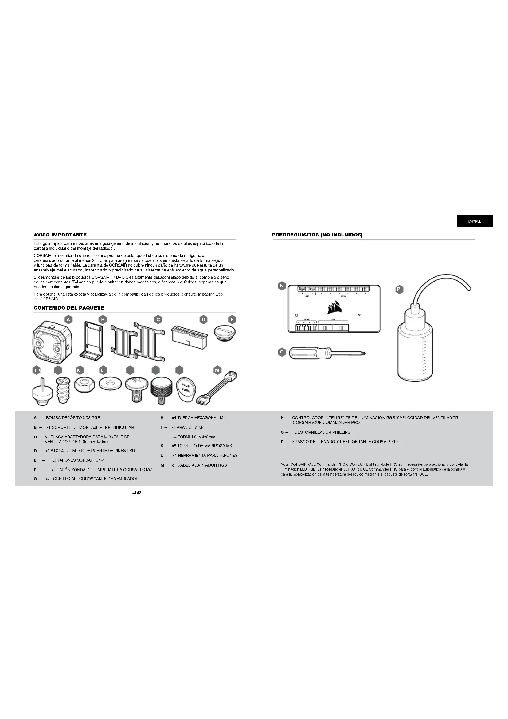 P — FRASCO DE LLENADO Y REFRIGERANTE CORSAIR XL5 Nota: CORSAIR iCUE Commander PRO o CORSAIR Lighting Node PRO son necesarios para accionar y controlar la iluminación LED RGB. Es necesario el CORSAIR iCUE Commander PRO para el control automático de la bomba y para la monitorización de la temperatura del líquido mediante el paquete de software iCUE.