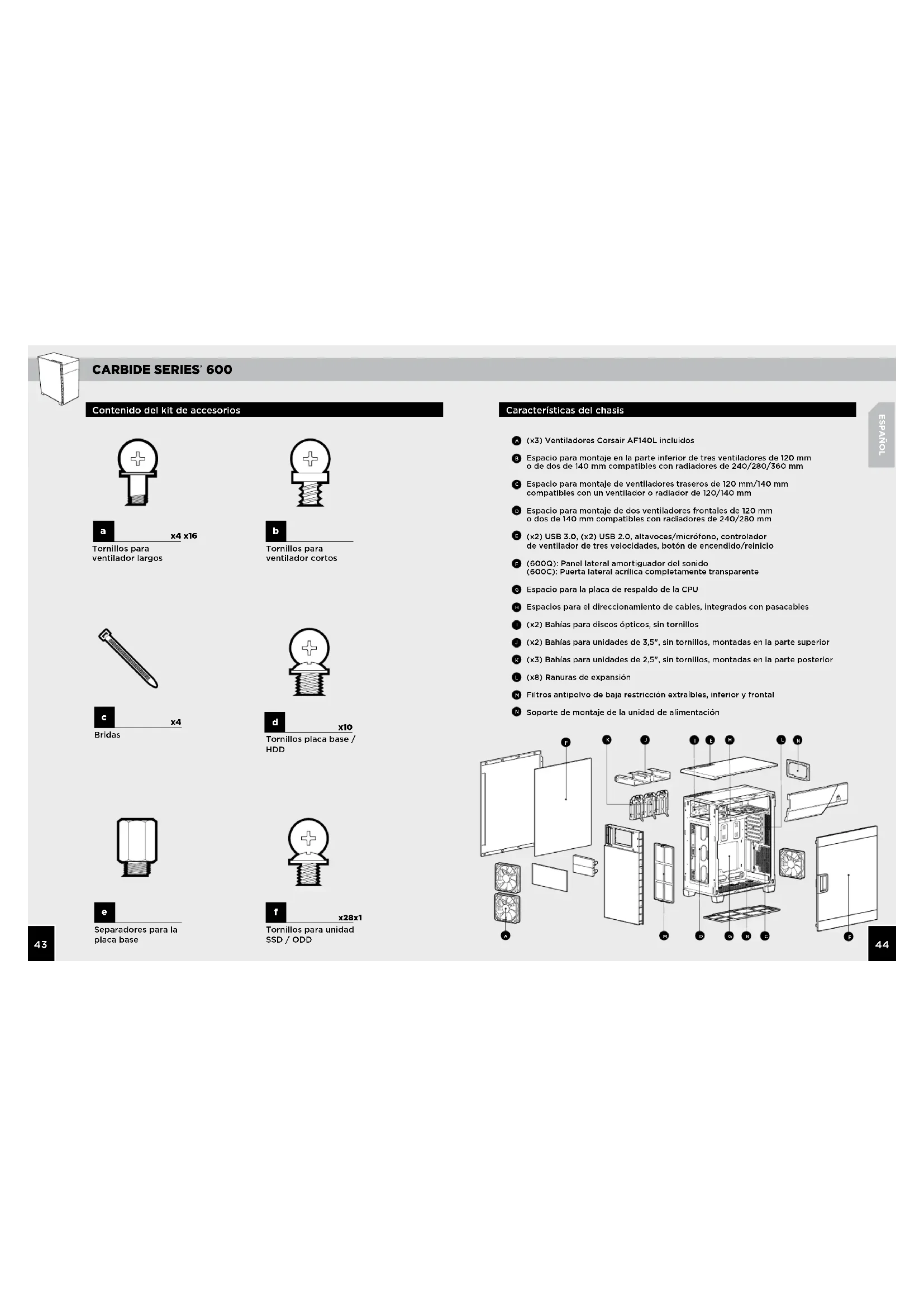 ESPAÑOL (x3) Ventiladores Corsair AF140L incluidos Espacio para montaje en la parte inferior de tres ventiladores de 120 mm o de dos de 140 mm compatibles con radiadores de 240/280/360 mm Espacio para montaje de ventiladores traseros de 120 mm/140 mm compatibles con un ventilador o radiador de 120/140 mm Espacio para montaje de dos ventiladores frontales de 120 mm o dos de 140 mm compatibles con radiadores de 240/280 mm (x2) USB 3.0, (x2) USB 2.0, altavoces/micrófono, controlador de ventilador de tres velocidades, botón de encendido/reinicio (600Q): Panel lateral amortiguador del sonido (600C): Puerta lateral acrílica completamente transparente Espacio para la placa de respaldo de la CPU Espacios para el direccionamiento de cables, integrados con pasacables (x2) Bahías para discos ópticos, sin tornillos (x2) Bahías para unidades de 3,5", sin tornillos, montadas en la parte superior (x3) Bahías para unidades de 2,5", sin tornillos, montadas en la parte posterior (x8) Ranuras de expansión Filtros antipolvo de baja restricción extraíbles, inferior y frontal Soporte de montaje de la unidad de alimentación